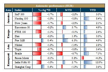 Listini in calo questa settimana, specialmente quelli americani sulla scia dell’incertezza circa la sostenibilità delle promesse elettorali di Trump relativamente agli sconti fiscali e agli investimenti in infrastrutture. Le difficoltà, che il Presidente sta attraversando nell’ottenere il sostegno repubblicano sulla modifica della riforma sanitaria, sono state interpretate dal mercato come un segnale di debolezza e come un segnale che la riforma fiscale potrebbe richiedere tempi più lunghi. Meglio l’Europa, dove i timori sulle spinte nazionalistiche si sono momentaneamente affievoliti, grazie all’esito delle elezioni olandesi. L’attenzione del mercato sembra orientata verso i segnali di miglioramento della crescita economica nell’Area.
