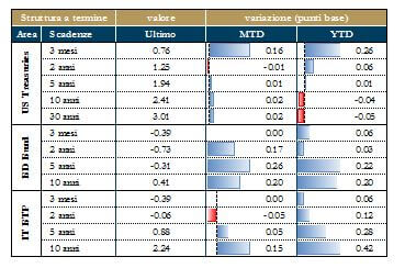 Mercati dei titoli di statoI rendimenti dei Treasury americani sono in rallentamento complici l’atteggiamento dovish della Fed e l’incertezza circa l’implementabiltà delle riforme di Trump.