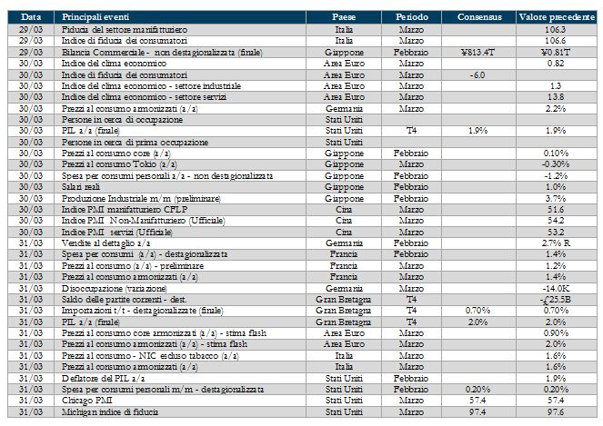 • Negli Stati Uniti, focus sulla terza lettura del PIL del Q4 anche per gli Stati Uniti. Disponibili, inoltre, redditi e spese personali di febbraio e consumi personali del Q4. Conference Board e Università del Michigan pubblicheranno i propri sondaggi sulla fiducia dei consumatori.