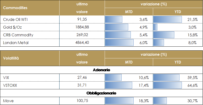 MATERIE PRIME E VOLATILITA’ L’aggravarsi della crisi Russia Ucraina con l’invasione militare russa in Ucraina pesa sui prezzi delle materie prime. La Russia ha un ruolo centrale nell’approvvigionamento energetico globale. Molti paesi europei sono strettamente dipendenti dalle forniture russe e questo amplifica la pressione sui prezzi. La Russia rappresenta il 40% delle importazioni di gas naturale dell’UE e circa il 30% delle sue importazioni di greggio. I mercati delle materie prime hanno già iniziato a valutare il rischio di interruzione delle esportazioni russe di energia verso l’Occidente. Il prezzo del petrolio ha superato i 100 dollari al barile per la prima volta dal 2014, mentre il prezzo del gas sul mercato di Amsterdam, benchmark del metano per l’Europa continentale ha sfiorato i 114 euro al megawattora per poi tornare attorno ai 104 euro al megawattora. |