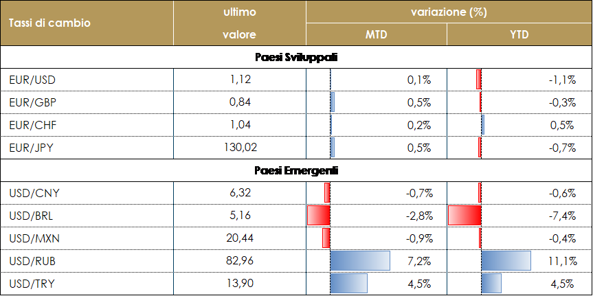 TASSI DI CAMBIO L’inaspettato peggioramento degli eventi in Ucraina ha portato il mercato FX a scambiare in modalità risk-off per buona parte della settimana. Il dollaro si è apprezzato contro tutte le altre valute, sia nel G10 che nei mercati emergenti, poiché la ricerca di un safe haven è stato il tema dominante, in particolare all’indomani dell’attacco russo, quando gli indici azionari globali hanno perso diversi punti percentuali in poche ore. La forza del dollaro si è concentrata soprattutto contro le valute europee. La nuova situazione geopolitica potrebbe provocare una battuta d’arresto della crescita economica europea e un ulteriore aumento dei prezzi dell’energia, complicando il processo di normalizzazione della politica monetaria, avviato da BCE e BOE tra la fine del 2021 e l’inizio del 2022. Una riunione d’emergenza è stata convocata dalla BCE per valutare la situazione; una conferenza stampa si terrà nel tardo pomeriggio di venerdì per informare il mercato sulla loro decisione. Nel frattempo, l’euro e la sterlina sembrano soffrire sia della forza del dollaro che del peggioramento delle prospettive economiche europee. Nei mercati emergenti, il rublo russo ha sofferto molto durante la settimana. Ha perso più del 7% contro l’euro e quasi il 10% contro il dollaro. Tutte le altre valute dell’Europa centrale sono state colpite duramente dall’aumento dell’incertezza: il fiorino ungherese ha perso il 4,2%, lo zloty polacco il -3,7% e la corona ceca è scesa più del 3% durante la settimana. Le valute del Latam si sono comportate come un bene rifugio in questa situazione, chiudendo la settimana quasi invariate contro il dollaro. A cura del team obbligazionario di Mediobanca SGR |