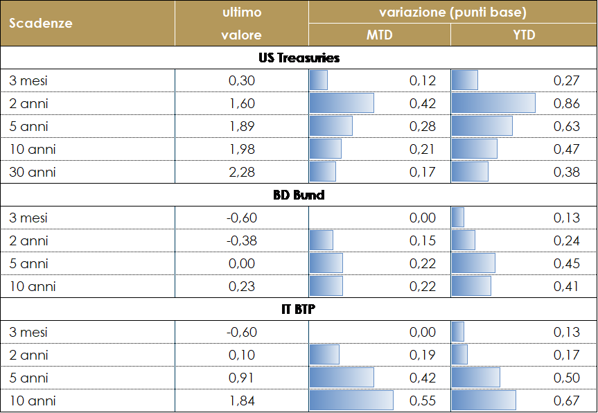 L’invasione su larga scala della Russia in Ucraina e l’escalation nella risposta alle sanzioni da parte dell’Occidente ha innescato un’impennata dell’avversione al rischio con una reazione di risk-off dei mercati, aggiungendo incertezza sulle prospettive economiche globali e complicando la normalizzazione della politica monetaria da parte delle principali banche centrale. I rendimenti obbligazionari a medio lungo temine sono scesi e break-even inflation hanno subito un’impennata sulla scia dell’aumento dei prezzi dell’energia, facendo diminuire i rendimenti reali. In questo contesto, i policy makers dovranno contemperare i rischi al rialzo per l’inflazione con i rischi al ribasso per l’attività economica. Il conflitto non bloccherà la normalizzazione della politica monetaria, ma l’invasione su larga scala dell’Ucraina dovrebbe rendere più cauti i policy makers. In Europa, la dipendenza energetica dell’Area Euro dalla Russia ha il potenziale di tradursi in un aumento più persistente dell’inflazione energetica (la durata del conflitto e la portata delle sanzioni saranno fondamentali per capirne l’entità di questo aumento) e di inasprire le condizioni finanziarie. Giovedì l’esponente BCE Stournaras in un’intervista a Reuters, ha affermato che la BCE dovrebbe proseguire il suo programma di acquisto di titoli almeno fino alla fine dell’anno per contrastare le ricadute di un conflitto in Ucraina. Nella stessa giornata Isabel Schnabel, membro del consiglio esecutivo della BCE, che già in precedenza aveva sottolineato il potenziale impatto negativo della crisi sull’economia sull’Area Euro ha affermato che “l’incertezza depone a favore di una normalizzazione graduale e data dependent, che rispetti la sequenza comunicata dalla BCE, capace di ridurre l’incertezza sulle sue azionii” della banca centrale. All’interno del Consiglio lo spettro di opinioni resta ampio, con Holzmann, De Cos e Vasle espressisi in senso restrittivo, mentre de Guindos, Villeroy e Centeno restano su posizioni più espansive. Negli Stati Uniti il mercato sembra prezzare più prudenza da parte della Ded. Il mercato si aspetta ora un rialzo di 25 pb a marzo ed attribuisce una probabilità di solo il 20% ad un rialzo di 50 punti base. Le tensioni sul mercato energetico può provocare per l’economia statunitense un aumento dell’inflazione importata via prezzo del petrolio, per questo i mercati si aspettano che la Fed sia costretta ad alzare di più i tassi, allo stesso tempo potrebbe tradursi in una crescita più debole. VIEW STRATEGICA Governativo US: I dati i sul mercato del lavoro e sull’inflazione statunitensi ihanno incoraggiato la Federal Reserve ad accellerare la rimozione dello stimolo monetario. La Federal Reserve terminerà il tapering nel primo trimestre dell’anno, poi inizierà in modo sequenziale ad aumentare il costo del denaro prima e a ridurre la dimensione del proprio bilancio. Questo causerà molto probabilmente un moderato aumento dei tassi a lungo termine negli Stati Uniti. Esprimiamo una view neutrale, poiché i livelli raggiunti assicurano un carry positivo. Governativo EU: Continuiamo ad avere una view negativa sui rendimenti obbligazionari europei, aspettandoci una perdita di valore sia dalla componente carry che dalla componente prezzo. |