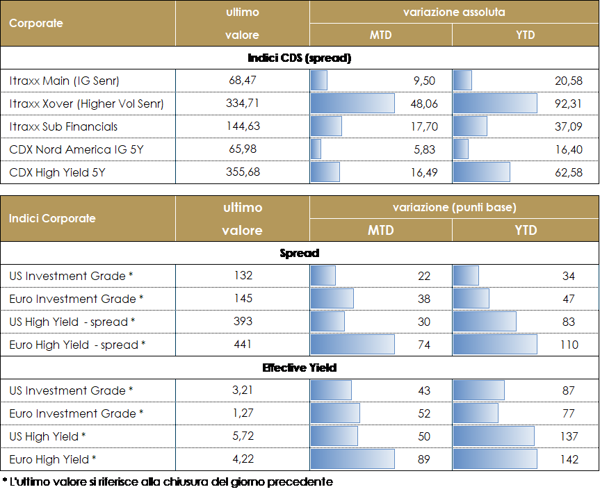Nella settimana in cui il principale rischio geopolitico è diventato un vero e proprio fronte di guerra in Ucraina, il mercato corporate ha subito le fasi altalenanti di attesa seguito nella giornata di giovedì da un sostanziale crollo delle quotazioni poi riprese in parte nella giornata odierna. L’impatto della crisi ucraina a livello sistemico è quello di una maggiore incertezza rispetto allo scenario macro, soprattutto in Europa, che genera direttamente una pressione all’allargamento degli spread, solo in parte mitigato dalle attese sui tassi; d’altra parte, a livello idiosincratico, aumentano i rischi di settori ed emittenti più direttamente esposti ai paesi in conflitto. Nel complesso il mercato cash ha fatto segnare una performance negativa, in particolare su HY e subordinati, con ribassi nel complesso vicini al punto percentuale nella giornata di giovedì, parzialmente ripresi in chiusura di settimana su chiusure di posizioni corte. Su Indici CDS, strumenti più liquidi e con movimenti ancora più ampi e veloci rispetto ai titoli cash, il movimento di allargamento ha toccato +50bp su Itrx Xover (HY Eur) nella giornata critica per poi rientrare e chiudere la settimana a -5bp. Anche su IG con un +10 nella fase critica gli spread sono poi tornati a stringere chiudendo la settimana a -2bp. Comportamento simile anche in US con CDX HY e CDX IG a -15 e -5bp dopo un allargamento di 30bp e 5bp nella giornata di giovedì. Il mercato primario ha vissuto una settimana inevitabilmente sottotono con alcune emissioni finanziarie nei primi giorni BPCE (BBB lt2 500Mio 10nc5 2.25% e senior np BBB+ 750Mio 7y 1.625%), Intesa (BBB Senr Pref 1.454% 600Mio), Natwest (A+ Senr 1Bio 1.375%) e ALD (BBB 700Mio 4y1.25%). Su corporate DBahn (AA Senr 750Mio 1.375%) e double tranche per Unilever (A+ 500Mio 4y 0.75% e 650Mio 9y 1.25%). A cura del team obbligazionario di Mediobanca SGR VIEW STRATEGICA Corporate IG: Il livello e le valutazioni degli spread rendono vulnerabile l’asset class rispetto alle variazioni dei tassi e all’inizio della normalizzazione delle politiche monetarie e potrebbero risentirne della volatilità che prevediamo in aumento. La ricerca di rendimento, la stagionalità che torna positiva e l’offerta netta contenuta prevista rimangono fattori tecnici supportivi. Esprimiamo una view neutrale. Corporate HY: Outlook neutrale dati i livelli raggiunti dalle valutazioni nonostante alcuni fattori, prevalentemente tecnici, e la ricerca di rendimento in assenza di alternative nel campo obbligazionario ci rendono costruttivi verso l’asset class ma necessariamente selettivi dato il prevedibile aumento del rischio idiosincratico in questa fase del ciclo. |