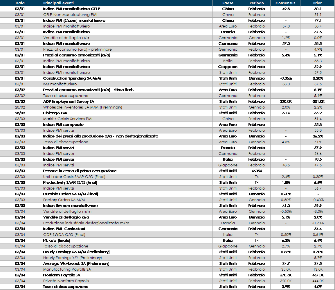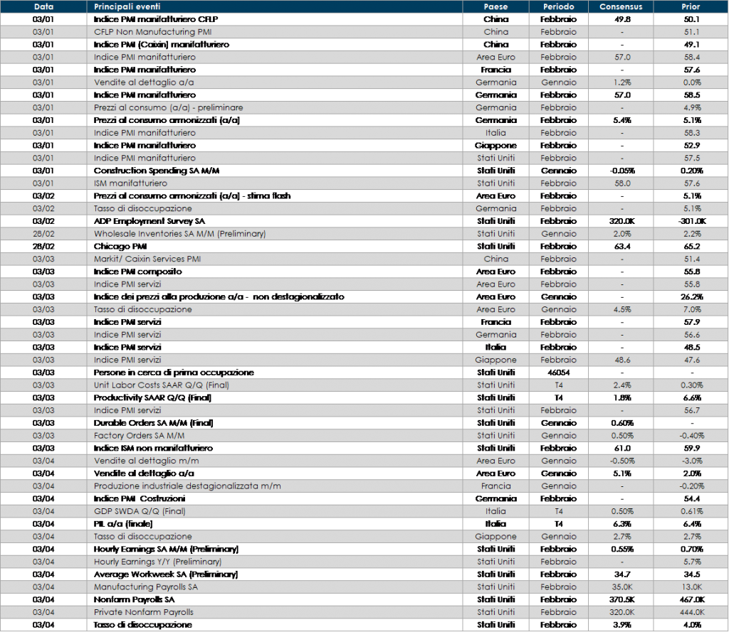 - Stati Uniti: la settimana prossima sarà pubblicato il report sul mercato del lavoro relativo al mese di febbraio. Inoltre, La testimonianza di Powell al Congresso fornirà un’immagine del pensiero della Fed.
