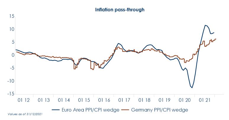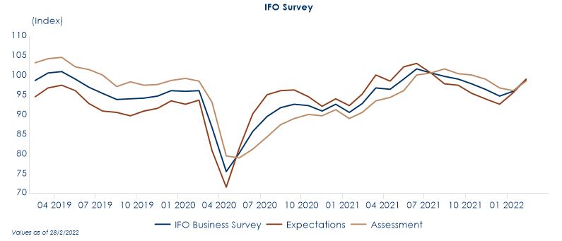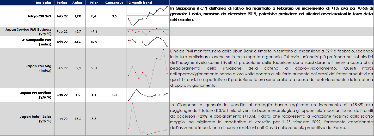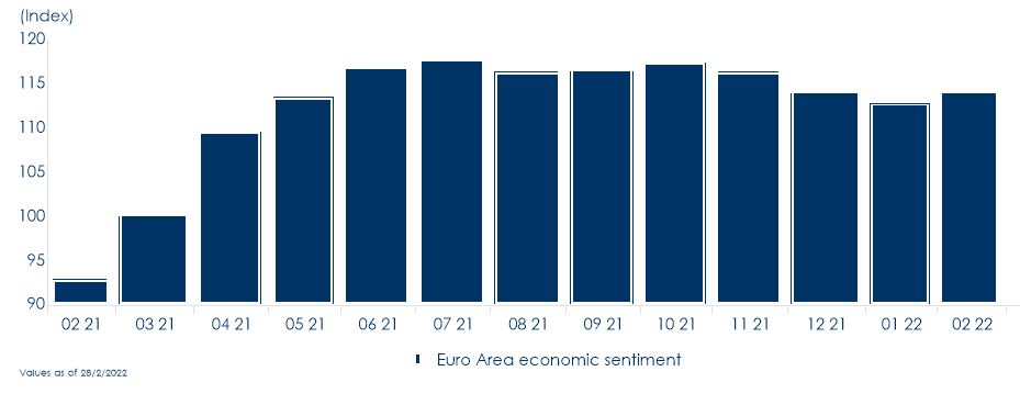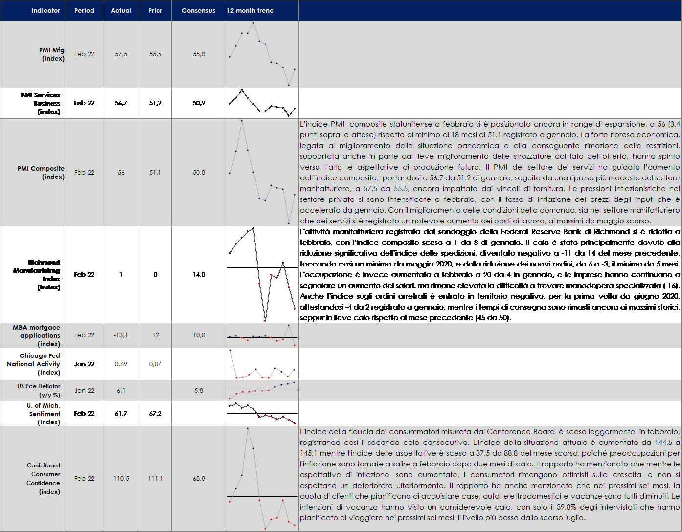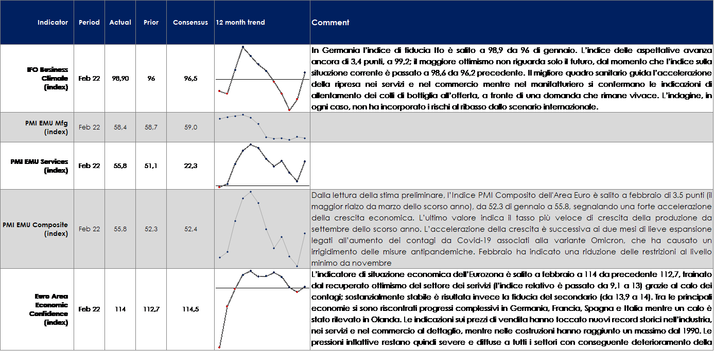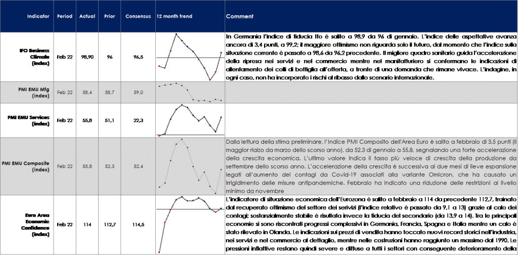 I dati economici pubblicati questa settimana confermano la forte accelerazione della ripresa economica, supportata dal rallentamento dei contagi da Covid e da un primo allentamento delle strozzature nelle catene di produzione. Tuttavia, l’invasione russa “su larga scala” dell’Ucraina rende più incerto lo scenario internazionale ed in particolare quello dell’Area Euro, penalizzata dalla dipendenza energetica dalla Russia. I rischi per la crescita sono ora rivolti verso il basso mentre il raggiungimento del picco dell’inflazione appare più lontano.