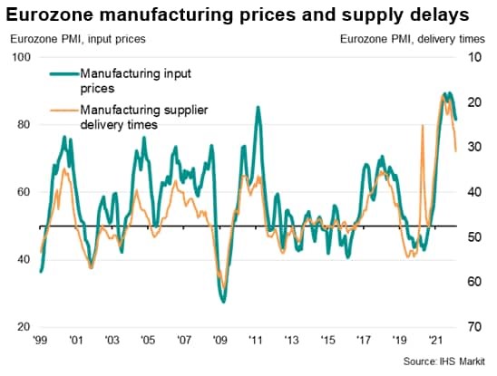 | In aggregato, l’indice manifatturiero ha segnalato una modesta flessione, ma la correzione è solo “aritmetica” e positiva per la crescita economica. Il rallentamento è, infatti, imputabile al miglioramento dell’indice sui tempi di consegna (che quando migliorano fanno diminuire l’indice PMI), accompagnato da un’accelerano della produzione e degli ordini. I servizi invece beneficiano del miglioramento della situazione sanitaria. | L’allentamento dei vincoli di fornitura registrato in febbraio ha aiutato a moderare l’inflazione dei costi degli input: il tasso di aumento dei prezzi medi pagati per i materiali è stato il più lento da marzo 2021, sebbene le pressioni inflattive sui prezzi ai consumi restino robuste e le imprese inizino a trasferire i maggiori costi produttivi agli utilizzatori finali sia nel comparto dei servizi sia nel comparto manifatturiero in maniera più significativa. |