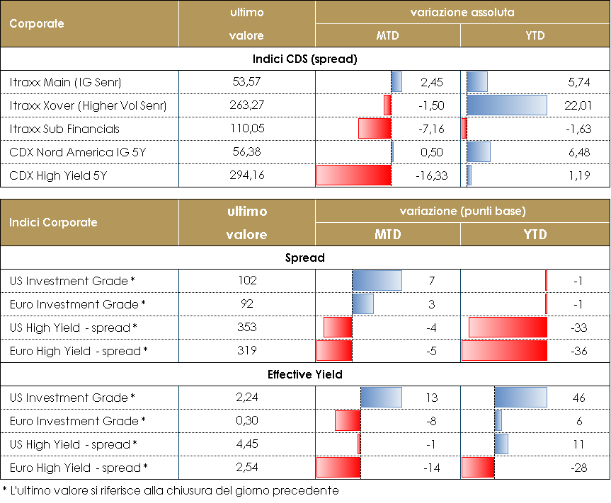 Il mercato corporate ha tradato in un range piuttosto ristretto con una buona chiusura nella giornata odierna sostanzialmente su buoni flussi e dati positivi sia dal lato macro che dalle notizie sull’avanzamento dei piani vaccinali in particolare in US e UK. I flussi sul mercato secondario vengono segnalati dai trading desks con un bias alla riduzione delle posizioni anche e soprattutto per far spazio all’abbondante flusso di nuove emissioni. Il mercato primario ha infatti vissuto una settimana con volumi in molto forti. Gli Spread su indici cds in lieve contrazione in Europa con IG (Itraxx Main) che ha chiuso la settimana a -2, mentre su HY (Itraxx Xover) performance migliore con -10bp, mentre in US spread in trading range con chiusure a -1bp su IG e -2bp su HY. Sul mercato primario molto attivo il comparto HY, con deal per Novelis (500Mio 3.375% 8y), Orpea ( 500Mio 7y 2%), Hapag Lloyd (300Mio 2.5% 7y), Saipem (500Mio, 3.125%, 7y) e Renault (600Mio 2.5% 7y). Su IG due deal triple tranche per Fresenius (da 500Mio, 0% 4.5y, 0.5% 7.5y, 0.875% 10.5y) e Vantage Towers (da 750Mio, 0% 4y, 0.375% 7y, 0.75% 9y), mentre singole emissioni per Tikehau (500Mio, 1.625%, 8y), UCB (500Mio, 1%, 7y), Stellantis (1.25Bio, 6y, 0.625%), Wolters Kluwer (500Mio, 0.25% 7y). Infine su finanziari nuova Socgen subordinata T2 (1Bio, 10nc5y, 1.125%) e double tranche seniore per UBS (Senior 1.5Bio 0.01% 5y e 1Bio 0.5% 10y). A cura del team obbligazionario di Mediobanca SGR PERFOMANCE DEI TITOLI CORPORATE – Dati aggiornati alle 17.30 del 26 marzo 2021 VIEW STRATEGICA Corporate IG: Il supporto della politica monetaria con acquisti diretti e forward guidance su “tassi bassi a lungo” giustificano i livelli compressi degli spread. Nel corso dell’anno il miglioramento del ciclo economico garantirà ulteriore supporto alla solidità dei fondamentali. Manteniamo una view neutrale Corporate HY: Outlook positivo ma possibili fasi di volatilità che potranno rappresentare occasioni di acquisto. Default rate contenuti con picco nel T1, su livelli comunque ridotti rispetto ai cicli precedenti. Supporto al mercato da fattori tecnici positivi e ricerca di rendimento. Manteniamo una view neutrale |