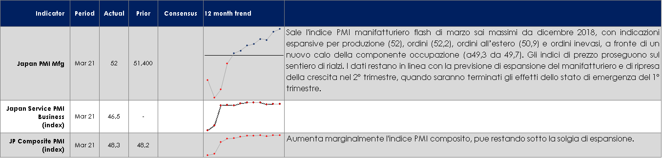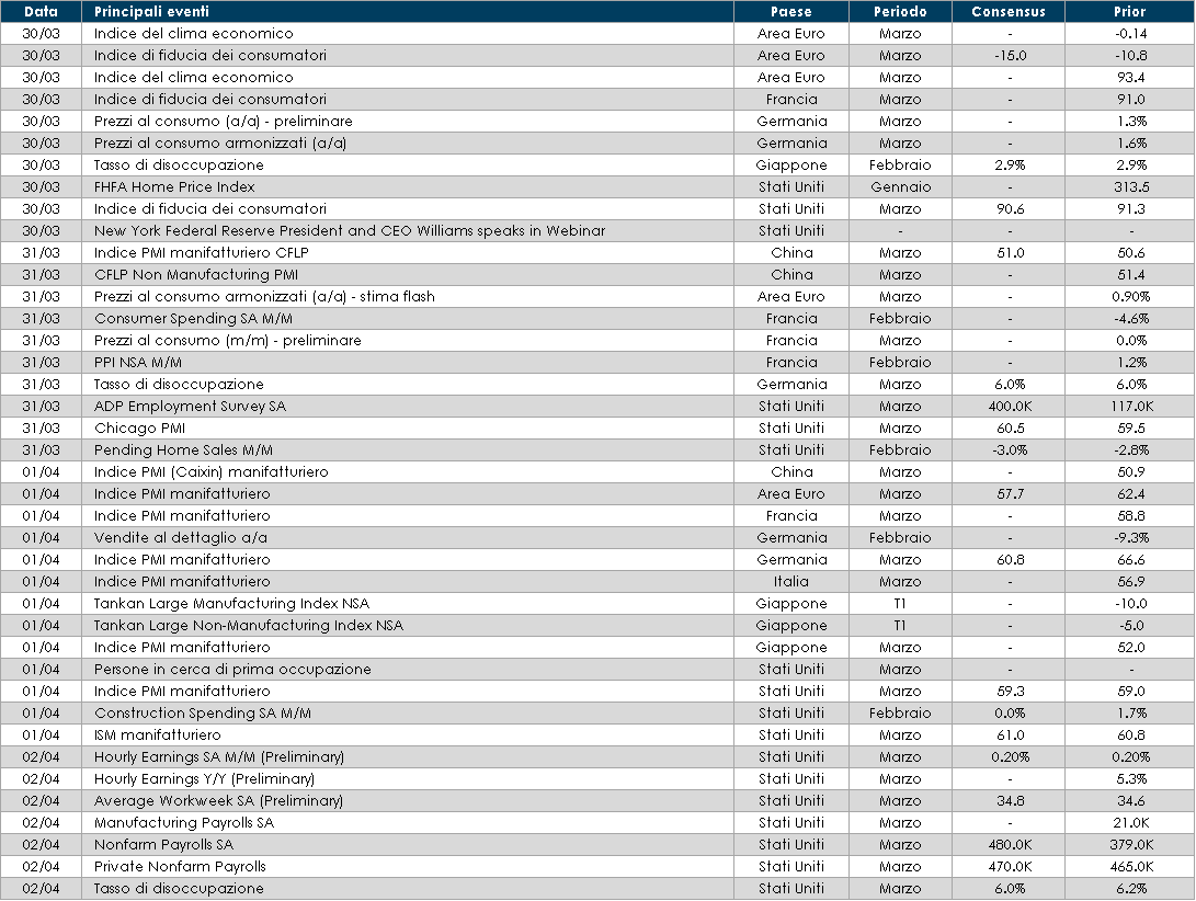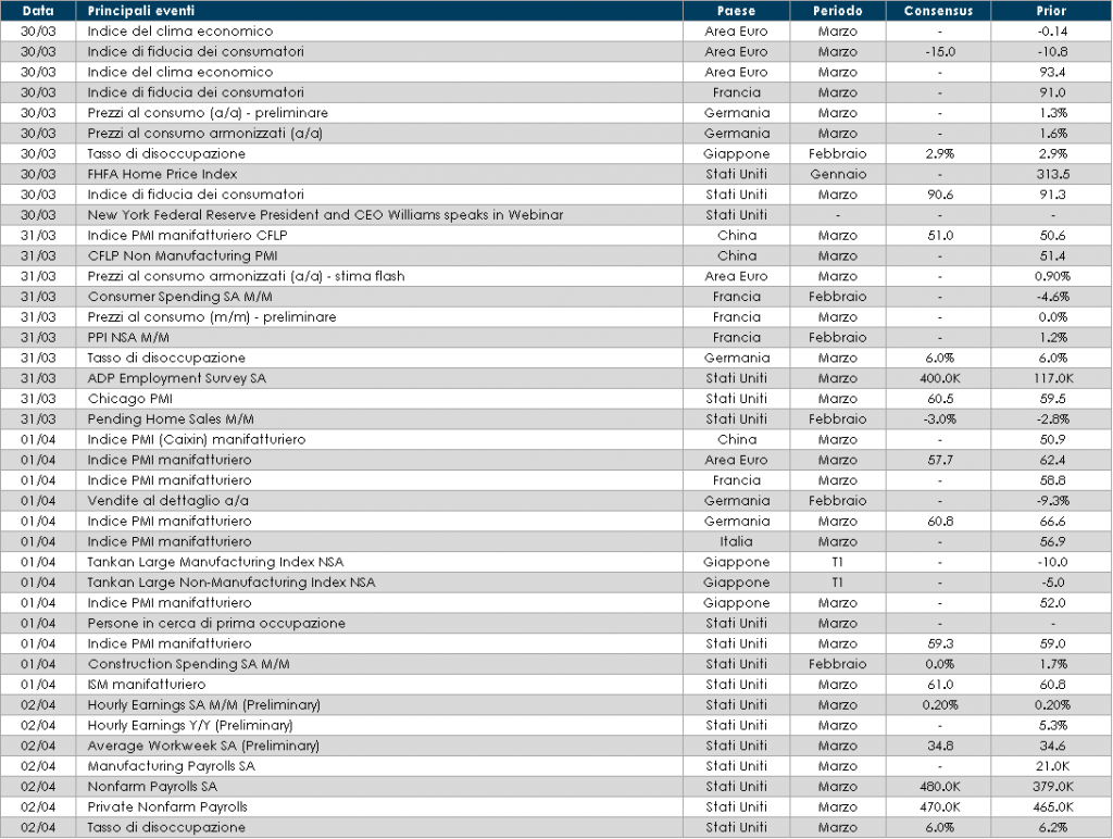 - Asia: in Cina saranno pubblicati gli indici PMI relativi al mese di marzo, mentre in Giappone sarà pubblicata la survey trimestrale Tankan, relativa al primo trimestre dell’anno.