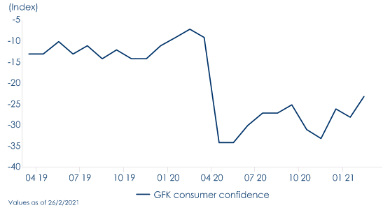 La svolta nei dati congiunturali in UK è coerente con i progressi sul fronte epidemiologico. Le nuove infezioni e i ricoveri continuano a diminuire, grazie a una campagna vaccinale che sta procedendo rapidamente, con il 42% della popolazione già vaccinata con almeno una dose. Il Regno Unito ha programmato una progressiva eliminazione di gran parte delle misure di contenimento all’attività economica. L’attuale “stay at home” terminerà il 29 marzo, mentre la seconda fase di riaperture – che include le vendite al dettaglio di beni non essenziali, le attività legate al tempo libero e l’alberghiero – è fissata per il 12 aprile. Inoltre, il governo Johnson si è impegnato a eliminare tutte le principali restrizioni entro la fine di giugno. Con l’allentamento delle misure di contenimento dell’attività economica, il governo britannico diminuirà progressivamente il sostegno fiscale all’economia. Data la ritrovata vivacità dell’economia britannica e la gradualità con cui i sussidi verranno meno, non si dovrebbe configurare alcun rischio al ribasso per la traiettoria di crescita. Da un lato, le misure a sostegno dell’occupazione – attraverso lo schema “furlough” e il sostegno ai lavoratori autonomi – scadranno solo alla fine di settembre, quando l’economia dovrebbe essere uscita dalle principali difficoltà. Dall’altro, lo sgravio delle tariffe commerciali e i tagli all’IVA per le industrie più duramente colpite (quelle alberghiere e relative al tempo libero) verranno meno solo a marzo 2022. Infine, la scadenza delle “super detrazioni” del 130% per gli investimenti aziendali e un aumento dell’aliquota principale dell’imposta sulle società dal 19% al 25% è fissata per aprile 2023. Tale programmazione del ritiro scaglionato del sostegno fiscale è stata studiata per condurre l’economia gradualmente fuori dalla recessione. Contestualmente, la politica monetaria resterà accomodante per tutto l’anno in corso, sebbene il meeting di marzo di politica monetaria ha mostrato una Bank of England (BoE) più hawkish della Fed e della BCE e non troppo preoccupata per il recente inasprimento delle condizioni finanziarie. Il MPC della BoE ha evidenziato che il recente aumento dei rendimenti governativi riflette un miglioramento delle prospettive di crescita e che, pertanto, si è detto pronto a concludere il proprio programma di QE entro la fine dell’anno, quindi ben prima della Fed e della BCE, favorendo così l’andamento della sterlina. Tuttavia, i mercati sembrano aver sovra-reagito a queste parole, prezzando un prematuro rialzo del costo del denaro già a fine 2022. La BoE seguirà il medesimo schema delle altre banche centrali, iniziando prima il processo di tapering e rimandando l’aumento del costo del denaro a non prima del 2023. Inoltre, la BoE dovrà continuare a monitorare gli effetti duraturi del “divorzio” del paese dall’UE, assicurando condizioni finanziarie accomodanti. La contestualità della pandemia e della Brexit ad oggi riduce la visibilità sulle conseguenze di quest’ultima sul settore estero britannico. Da un lato, l’accordo di Brexit garantisce che la maggior parte delle merci scambiate tra l’Ue e UK non sia colpita da dazi o restrizioni quantitative. Dall’altro, gli esportatori di entrambe le parti stanno affrontando una serie di ostacoli normativi, che rendono di fatto più oneroso il fare affari nel mercato della controparte. Per questo, ad esempio, il Regno Unito ha deciso di estendere unilateralmente fino ad ottobre 2021 il “periodo di grazia” sui controlli doganali di beni e merci che viaggiano dalla Gran Bretagna ed entrano in Irlanda del Nord (il periodo di grazia doveva originariamente scadere il primo aprile prossimo). In gennaio, esportazioni ed importazioni hanno subito un crollo rispettivamente di 18,3% m/m e 22,8% m/m. È chiaro che la fine del periodo di transizione della Brexit il 31 dicembre 2020 ha giocato un ruolo importante (mentre le esportazioni di beni verso l’UE sono scese del 41,7% m/m, le esportazioni di beni verso l’extra UE sono aumentate dell’1,6% m/m), ma non è stato l’unico fattore. Il calo dell’attività economica sia in patria che all’estero causato dalle restrizioni dettate dalla pandemia restrizioni ha ridotto i flussi commerciali. Le esportazioni del Regno Unito verso gli Stati Uniti (che ovviamente non sono soggette alle nuove procedure commerciali) sono scese del 7,8% m/m e le esportazioni verso la Cina (dove il COVID-19 non ha frenato l’attività) sono aumentate del 29,1% m/m.