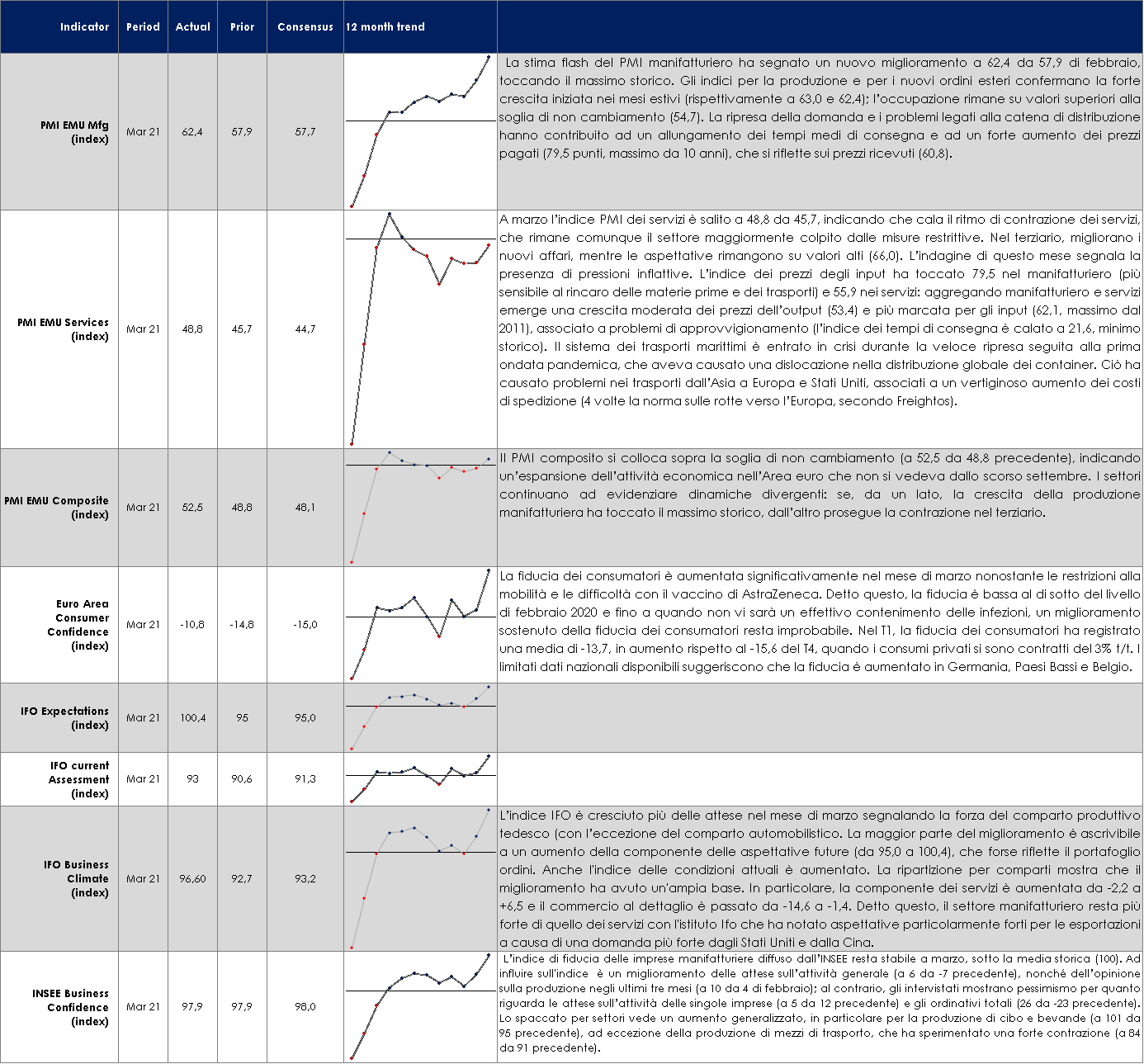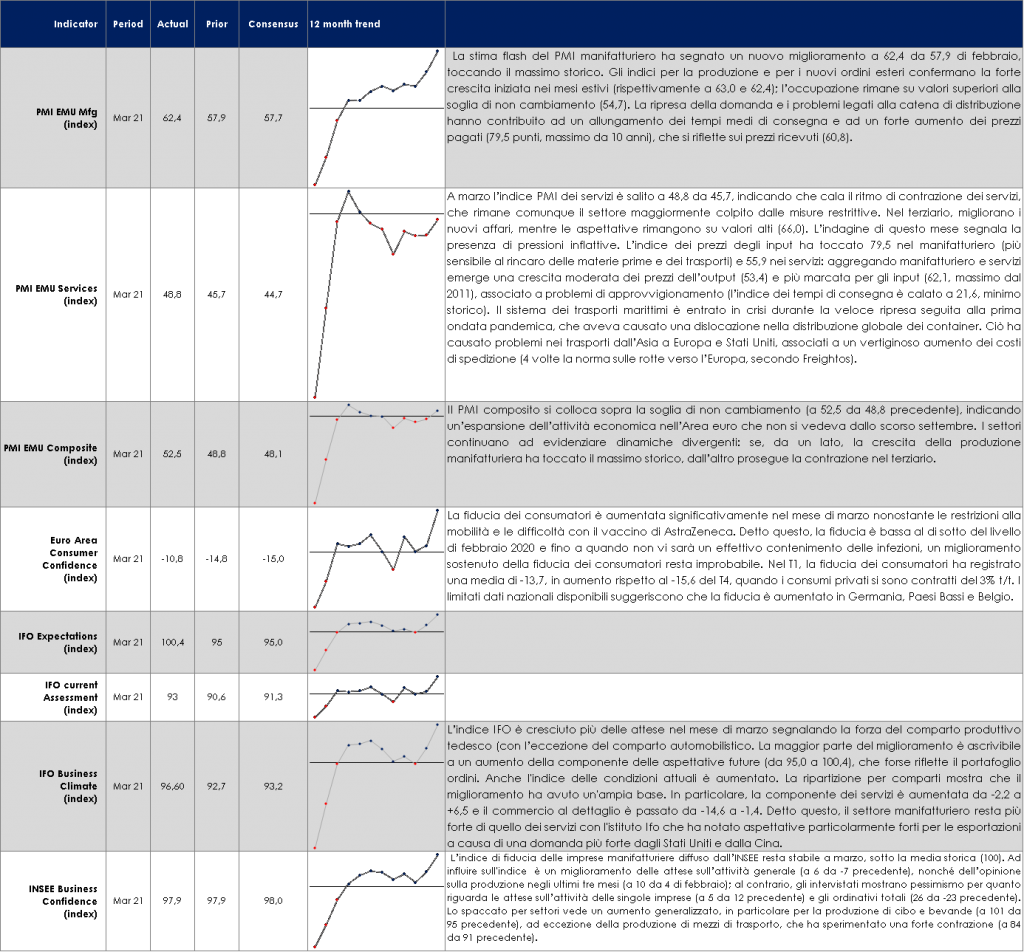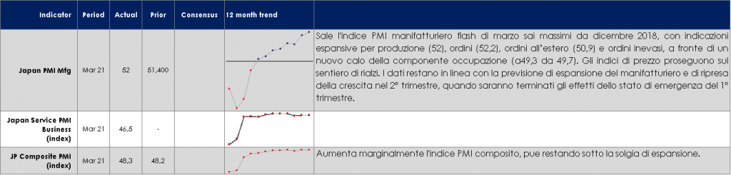 L’economia del Regno Unito mostra segni di un significativo rimbalzo, complice il successo della campagna vaccinale. L’indice PMI composito di marzo ha superato significativamente la soglia di espansione attestandosi a 56,6 (dal 49,6 di febbraio), registrando il tasso di crescita più elevato da agosto 2020. Il miglioramento è alimentato da forti guadagni nelle componenti prospettiche quali aspettative delle imprese e nuovi ordini (in aumento per la prima volta da settembre 2020) ed è imputabile al rimbalzo delle vendite in vista dell’allentamento delle misure di contenimento, a una maggiore fiducia dei consumatori e a un aumento della domanda di servizi immobiliari residenziali. Degno di nota è il fatto che il rimbalzo non è avvenuto solo nel comparto manifatturiero, che da mesi ha mostrato un’elevata capacità di adattamento alla pandemia, ma si è esteso al settore dei servizi. L’indice PMI dei servizi si è attestato a 56.8 (dal 49.5 di febbraio), registrando un massimo da 7 mesi. Contemporaneamente proseguono i miglioramenti anche nel mercato del lavoro (gli ultimi dati mostrano un aumento delle buste paga di 67.899 unità a febbraio, dopo il +55.028 di gennaio e il +73.990 di dicembre, con un tasso di disoccupazione tornato al 4,8% alla fine di gennaio), mentre l’inflazione core si sta stabilizzando attorno all’1% (0.9% a/a a febbraio), dopo aver assorbito le spinte al ribasso provenienti dalla pandemia e dal tasso di cambio.