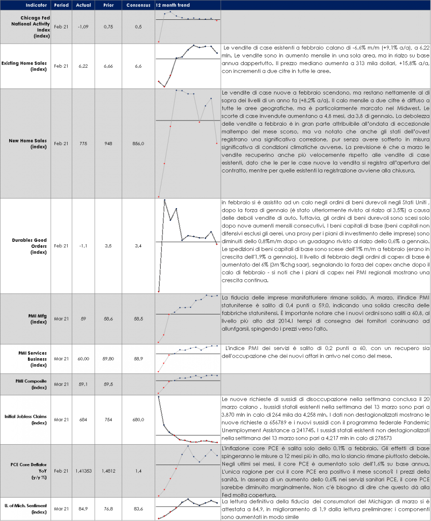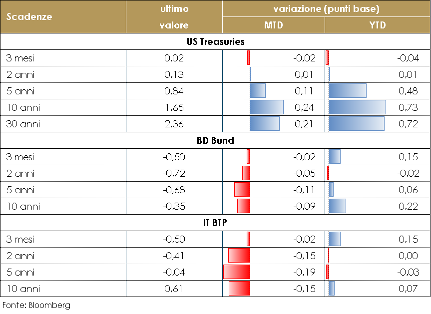 Dopo il forte movimento degli ultimi mesi di crescita dei rendimenti dei titoli governativi e di steepening delle strutture a termine (il cosiddetto trade di reflazione), questa settimana si è assistito ad un modesto rintracciamento. Sia la struttura a termine USA sia quelle dell’Area Euro hanno ritracciato di circa 10 punti base dai massimi osservati la settimana scorsa. Nelle prossime settimane dovremo vedere una progressiva riduzione del beta tra i tassi USA e UE, riflettendo anche il ritmo accelerato degli acquisti PEPP della BCE: la scorsa settimana, complici anche i minori rimborsi, il programma ha visto gli acquisti netti salire a quasi €22mld (dai €14mld della precedente), confermando che la forchetta €20-25mld sarà la normalità nell’immediato futuro. Tuttavia, commenti proveniente dai membri del Consiglio Direttivo della BCE continuano ad evidenziare che non vi è consenso all’interno del Consiglio stesso su come definire le condizioni di finanziamento favorevoli.) In settimana Isabel Schnabel è tornata sul tema delle “condizioni finanziarie favorevoli”, ribadendo che la politica monetaria dovrebbe limitarsi a garantire che queste siano mantenute per il tempo necessario. E ciò è possibile sfruttando la flessibilità degli acquisti PEPP, che permette di garantire la stabilità delle condizioni alle quali stati, imprese e famiglie possono accedere al credito. Schnabel ha poi aggiunto che la BCE si focalizza sui tassi reali e non su quelli nominali, e che il concetto di “favorevole” si evolve con le condizioni economiche, quindi un aumento dei tassi reali è consono se l’economia si riprende. Isabel Schnabel è sembrato così suggerire che gli aumenti dei tassi di interesse sia nominali che reali potrebbero essere tollerati se i tassi di interesse di equilibrio aumentassero con la ripresa del ciclo. Di conseguenza, supponiamo che la BCE rimarrà vaga su questi obiettivi (rendimenti sovrani nominali, spread sovietici, swap in euro, tassi reali) e qual è il suo livello di riferimento (il livello delle riunioni di dicembre 2020 e gennaio 2021 come suggerito da Fabio Panetta o un livello variabile, come suggerito da Isabel Schnabel. PERFOMANCE DEI TITOLI DI STATO – Dati aggiornati alle 17.30 del 26 marzo 2021 Governativo US I rendimenti dei Treasury US hanno mostrato una modesta tendenza al rialzo, sulla scia della rimodulazione delle attese di crescita economica e dell’aumentato stimolo fiscale. La normalizzazione economica dovrebbe esercitare una certa pressione sui tassi a lunga, che tuttavia registreranno solo aumenti modesti, perché manipolati dalla Fed. Esprimiamo una view neutrale. Governativo EU: I titoli governativi europei hanno evidenziato un decoupling da quelli statunitensi mostrando una tendenza al ribasso, sulla scia delle aspettative di un ulteriore allentamento monetario da parte della BCE di ottobre e giustificato da un’inflazione negativa e da una debole prospettiva economica |