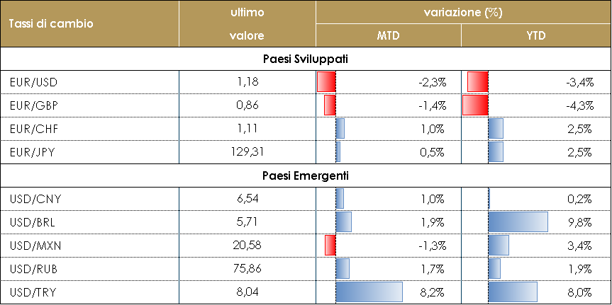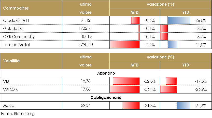 Il prezzo del petrolio si attesta poco sopra i 60 $al barile, dopo una settimana piuttosto volatile. A inizio settimana il prezzo del petrolio aveva beneficiato dei dati più rassicuranti sui PMI manifatturieri, ma soprattutto del blocco del Canale di Suez – da Suez transita il 7% del commercio mondiale di greggio e il 12% del commercio globale – a causa di una portacontainer che, incagliatasi, ostruisce il passaggio delle petroliere in partenza dal Medioriente. I ritardi causati dall’incidente rischiano di logorare ulteriormente catene di approvvigionamento di beni e materie prime, che ancora faticano a riprendersi dal colpo inferto dalla pandemia. Il prezzo del petrolio ha poi ripiegato giovedì, nonostante le riserve settimanali petrolifere a cura del Dipartimento dell’Energia americano abbiano registrato un incremento di soli 1,9 milioni di barili di prodotto grezzo e di soli 204.000 barili per le benzine, segnale di forti consumi al dettaglio. Il peggioramento delle stime dei tempi per la rimozione della nave dal canale di Suez (La lista delle navi cargo in attesa si è allungata da 180 della scorsa settimana a quasi 250, con un carico di petrolio che si stima di 2 mln di barili al giorno) lo ha fatto ritornare sopra i 60 $. PERFORMANCE – Dati aggiornati alle ore 17.30 del 26 marzo 2021 TASSI DI CAMBIO La settimana è iniziata con Erdogan che ha licenziato il governatore della Banca centrale turca Naci Agbal. Agbal era responsabile della politica monetaria in Turchia dallo scorso novembre; è stato in grado di ricostruire la fiducia del mercato nella lira turca (TRY) con decisioni politiche difficili. L’ultima, pochi giorni prima del suo licenziamento, è stato un aumento dei tassi di interesse di 200 pb, che ha aperto ad un nuovo massimo della TRY contro l’USD. La decisione di Erdogan ha mandato la valuta in caduta libera: lunedì, all’apertura, il TRY ha perso più del 13% contro l’USD e ha passato quasi tutta la settimana vicino a quei livelli depressi. Come sempre accade quando un evento imprevedibile si verifica nei mercati emergenti, le valute ad alto beta (Real brasiliano, Rand sudafricano) sono state pesantemente penalizzate. I principali beneficiari di questo evento sono state le tradizionali valute rifugio, ovvero lo yen giapponese e il dollaro statunitense. Il biglietto verde ha rotto un livello tecnico ampiamente monitorato dal mercato (media mobile a 200 giorni) che si trovava a 1,1870 e ha chiuso la settimana sotto 1,18. A spingere al rialzo il dollaro non è stato solo l’aumento della volatilità nei mercati emergenti, ma un sentimento più generale di avversione al rischio che ha pesato su specifici settori del mercato (l’S&P 500 ha chiuso la settimana invariato, mentre il NASDAQ ha perso quasi il 2%). A cura del team obbligazionario di Mediobanca SGR PERFORMANCE TASSI DI CAMBIO –Dati aggiornati alle ore 17.30 del 26 marzo 2021 |