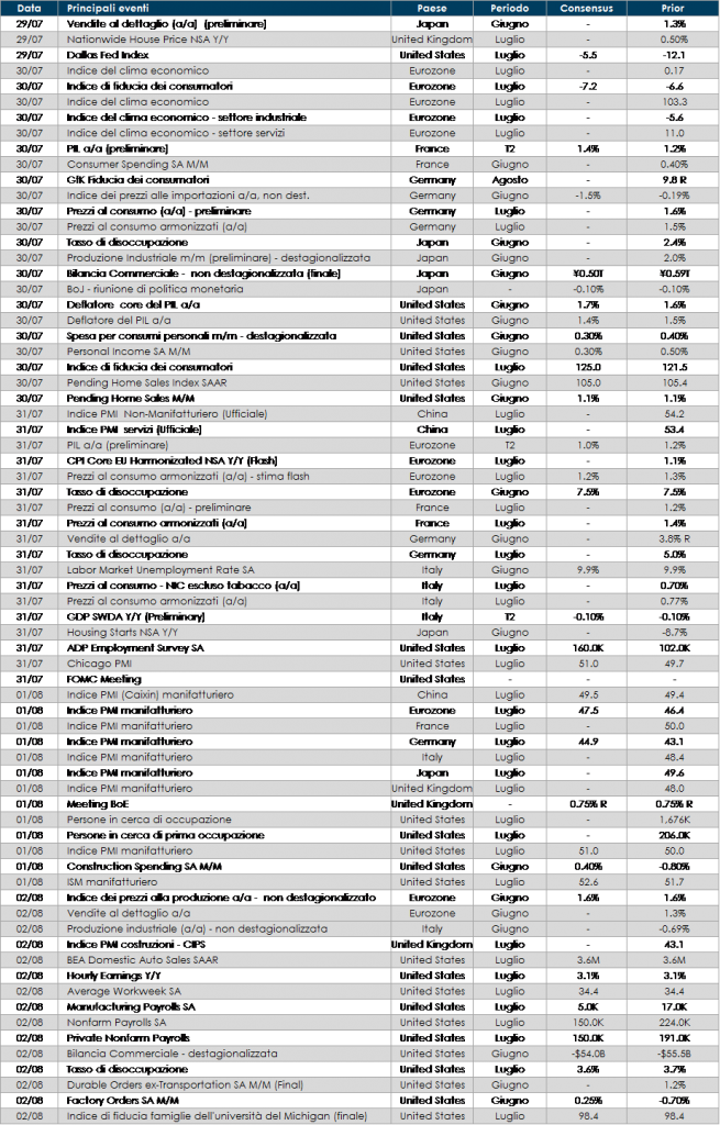 • Stati Uniti: l’attenzione sarà rivolta alla riunione di politica monetaria del FOMC e al report sul mercato del lavoro relativo al mese di luglio nonché l’ISM di luglio;