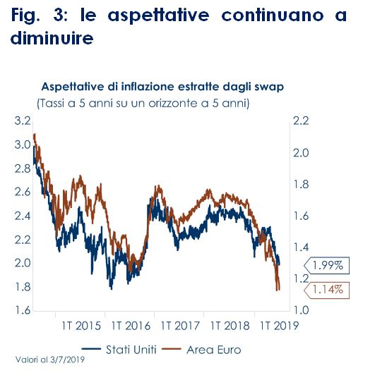 Durante la sessione di Q&A, il Presidente Draghi ha dichiarato che le decisioni di questa riunione sono frutto di un’ampia discussione all’interno del CD, segnalando implicitamente la non unanimità sulla decisione di utilizzare un mandato simmetrico sull’inflazione. Al contempo, ha dichiarato che il CD non ha discusso i limiti sul processo di acquisto titoli, le regole di acquisto basate sulle capital key, su quando agire e se farlo con singole misure scadenziate nei mesi autunnali o con un pacchetto di misure congiunto a settembre, rimandando così a dopo l’estate tutte le decisioni operative. Nel descrivere il contesto macroeconomico, il Presidente Draghi ha manifestato preoccupazione per lo scenario internazionale e per le sue ripercussioni sulla congiuntura dell’Area Euro: i dati recentemente pubblicati hanno mostrato che la ripresa attesa per la seconda parte dell’anno non è in atto e che, invece, la situazione economica sta progressivamente peggiorando, specialmente nel comparto manifatturiero, a fronte di un settore dei servizi e delle costruzioni resiliente e di un mercato del lavoro in progressivo miglioramento. Considerando il livello elevato di incertezza politica (le tensioni commerciali permangono, mentre è aumentata la probabilità a favore di una Hard Brexit), i rischi per la crescita continuano ad essere rivolti verso il basso, sebbene il rischio di recessione resti limitato. Toni più preoccupanti sono stati utilizzati per descrivere lo scenario sull’inflazione: l’inflazione corrente resta silente (Fig.1), perché il processo di trasmissione alla stessa dei miglioramenti della dinamica occupazionale si sta dimostrando lento(Fig.2), mentre le aspettative di mercato continuano a diminuire (Fig.3). Il presidente Draghi Draghi ha ribadito più volte che al CD “non piace ciò che vede” per quanto riguarda l’inflazione realizzata e le aspettative inflazionistiche La BCE continua a sottolineare la necessità di orientare le politiche di bilancio in modo più favorevole alla crescita e di intervenire con riforme strutturali. Il mercato ha reagito alla dichiarazione della BCE inizialmente in modo positivo (i rendimenti dei titoli di stato sono scesi e i listini azionari hanno puntato verso l’alto), ma successivamente, durante la conferenza stampa, gli asset finanziari hanno ritracciato i movimenti registrati inizialmente. Il mercato sembra dubitare dell’effettivo commitment della BCE a introdurre nuove misure di stimolo. Riteniamo che la BCE abbia espresso un atteggiamento profondamente dovish, rimandando le decisioni operative a settembre, quando avrà a disposizione le nuove previsioni su crescita e inflazione e gli studi preparatori per il nuovo programma di QE e per l’implementazione del sistema di tearing, da affiancare al taglio del costo del denaro (il presidente Draghi ha chiarito che, se vi sarà un taglio del tasso di deposito, questo sarà affiancato da un sistema di tiering).