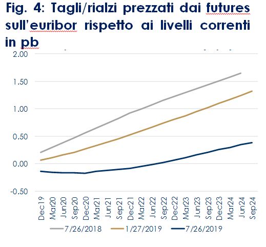 Fig. 4: Tagli/rialzi prezzati dai futures sull’euribor rispetto ai livelli correnti in pb