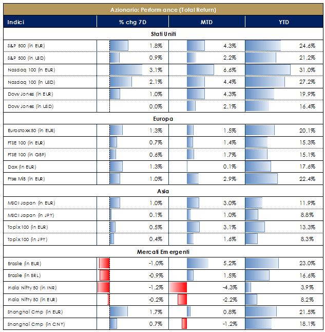 Settimana positiva sui mercati azionari, che da un lato cercano di interpretare il peggioramento del quadro macroeconomico (soprattutto del settore manifatturiero) e dall’altro sono in attesa di un sostegno da parte delle banche centrali. Da inizio anno, il rendimento in valuta locale sui principali listini è del 20/25% in USA e Europa e del 10% sui mercati emergenti. A livello settoriale da inizio anno spiccano, sia in USA che in Europa la tecnologia (+30/35%) e, a seguire, industriali e consumi (+25% circa). Il trend degli utili attesi a 12 mesi a/a continua invece a deteriorarsi, ma in USA è ancora in territorio positivo (+5% circa). La “stagione degli utili” appena iniziata vede in USA circa un terzo delle società che hanno riportato: le sorprese positive (sia in termini di vendite che di utili) sono state circa il 65%, con una sorpresa aggregata sugli utili attorno al 4.7% (contribuisce in termini positivi la tecnologia). In Europa, a parità di società che hanno riportato, le sorprese (per utili e vendite) sono del 55/60% con una sorpresa aggregata sugli utili di oltre il 5% (in questo caso sono i settori difensivi – farmaceutici e utilities – a contribuire maggiormente). In termini di flussi e posizionamento, il mercato rimane ancora “scarico” sul mercato azionario e, sebbene il sentiment sia migliorato, rimane ancora lontano da eccessi positivi, in attesa del meeting della prossima settimana da parte della Federal Reserve.