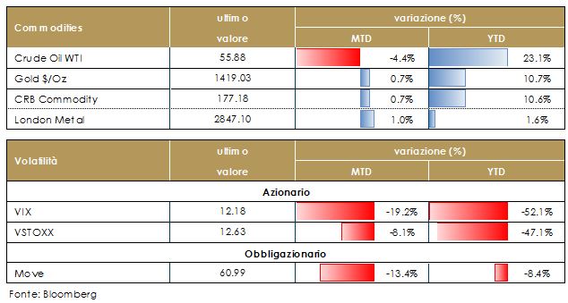 Materie prime in leggero ribasso nel corso della settimana e da inizio mese. Il petrolio nell’ultimo mese oscilla tra 55 e 60 dollari al barile. Le scorte di greggio US continuano a calare (mentre rimangono invariate quelle strategiche). L’EIA ha indicato come gli stock di petrolio (negli ultimi sette giorni) siano calati di 10,8 milioni di barili contro attese di -4,44 milioni. Rimane sui massimi degli ultimi sei anni il prezzo dell’oro attorno a 1400$, sinonimo di una percezione di rischi presenti sul mercato dal punto di vista macroeconomico e geopolitico. La volatilità implicita sui mercati azionari rimane invece su livelli storicamente molto compressi.