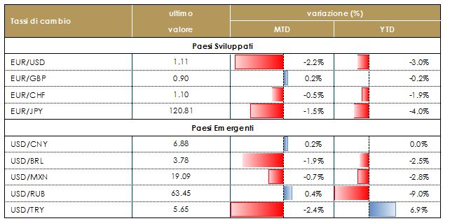 Le prospettive a breve termine sul mercato dei cambi restano guidate dai progressi nei negoziati USA-Cina e dalla rimodulazione delle politiche monetarie delle banche centrali in risposta all’elevata incertezza, all’indebolimento dei dati e al calo delle aspettative di inflazione. Si deprezza nel corso della settimana l’euro contro le principali valute e da inizio anno la valuta comune ha perso circa il 3% verso dollaro, il 4% verso yen e il 3% verso il franco svizzero. Pesa il peggioramento del quadro macroeconomico europeo, con il vecchio continente che rischia di essere il fanalino di coda della crescita economica globale. A fronte di questa situazione, le mosse della banca centrale europea potrebbero incidere sulla debolezza della valuta, visto l’atteggiamento estremamente accomodante. Settimana di debolezza anche per la sterlina: gli investitori sono preoccupati vista l’ascesa di Boris Johnson a primo ministro, grande sostenitore della hard Brexit, il cui approccio alla trattativa rischia di portare ad una rottura con l’Europa.
