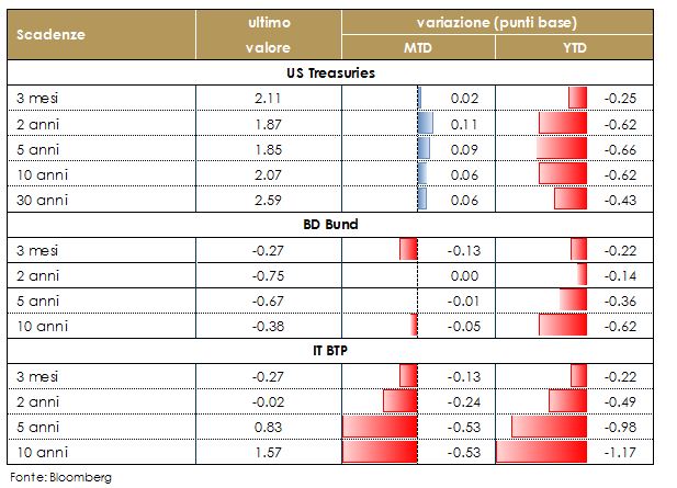 L’andamento dei rendimenti dei titoli di stato dei principali paesi sviluppati hanno avuto un andamento misto, sebbene prevalentemente le strutture a termine hanno registrato un appiattimento.  In particolare, il livello dei tassi sui governativi europei continua ad essere guidato dalle aspettative di politica monetaria della BCE. Infatti i rendimenti dei bund sono scesi mercoledì dopo la pubblicazione dei dati deludenti sul manifatturiero, mentre la scelta della BCE di rimandare a settembre ogni decisione effettiva, delineando nella riunione attuale la cassetta degli attrezzi e modificando solo marginalmente la forward guidance e la definizione dell’obiettivo di inflazione da raggiungere, ha avuto come effetto sui mercati un incremento della volatilità. L’attenzione è ora rivolta al meeting del FOMC della prossima settimana: si dovrebbe assister ad un taglio del costo del denaro di 25 pb. Sebbene i dati recentemente siano stati migliori delle attese, la Fed ha chiarito che risponderà con un taglio del costo del denaro ai crescenti rischi di una guerra commerciale e alla debolezza dei dati globali. Inoltre, si riunirà anche la BoE, che dovrebbe diventare anch’essa più dovish, date le crescenti incertezze sul processo di Brexit, aprendo ad un taglio dei tassi in autunno. Infine la settimana prossima si riunirà anche la BoJ, che dovrà rispondere alle crescenti incertezze sulle sue prospettive di crescita e inflazione. Per quanto riguarda la crescita, la domanda esterna resta debole, mentre l’imminente aumento dell’imposta sui consumi si aggiunge ai rischi di ribasso della domanda interna. Nel frattempo, l’inflazione resta lontana dall’obiettivo della banca centrale. Infine la svolta dovish di Fed e BCE ha riacceso il dibattito all’interno della BoJ sulla necessità di nuove misure di allentamento.