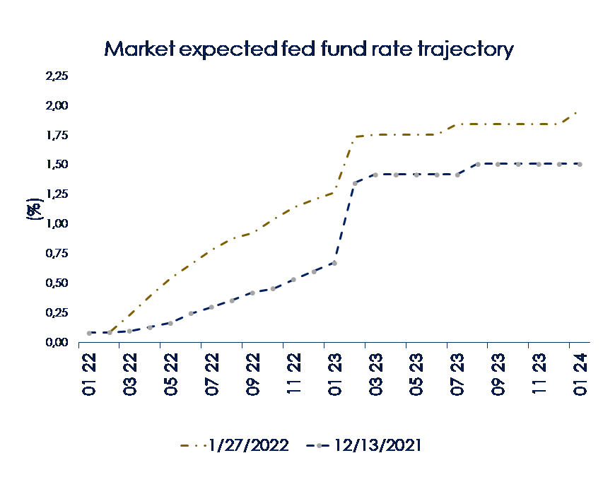 | La riunione del FOMC di gennaio ha lasciato invariato il target range per il tasso dei fed funds allo 0-0,25%, preannunciando, però, le prossime misure di normalizzazione della politica monetaria, rialzo dei tassi e Quantitative Tightening (QT). Nello statement si legge che “sarà presto appropriato aumentare l’intervallo obiettivo per il fed fund rate”, mentre durante la conferenza stampa il presidente Jerome Powell ha affermato che il FOMC già ora “è dell’idea” di intervenire nella prossima riunione, poiché il mercato del lavoro è “molto, molto forte” e l’inflazione sopra il 2%. Nel frattempo, la Fed continuerà a ridurre il ritmo mensile dei propri acquisti, che finiranno all’inizio di marzo e il QT inizierà in “modo prevedibile” solo dopo il primo rialzo dei tassi. Particolare è stata l’attenzione posta da Powell nel ribadire sia la sequenza progressiva degli interventi sia il desidero di non sorprendere i mercati, per evitare un repentino restringimento delle condizioni finanziarie.