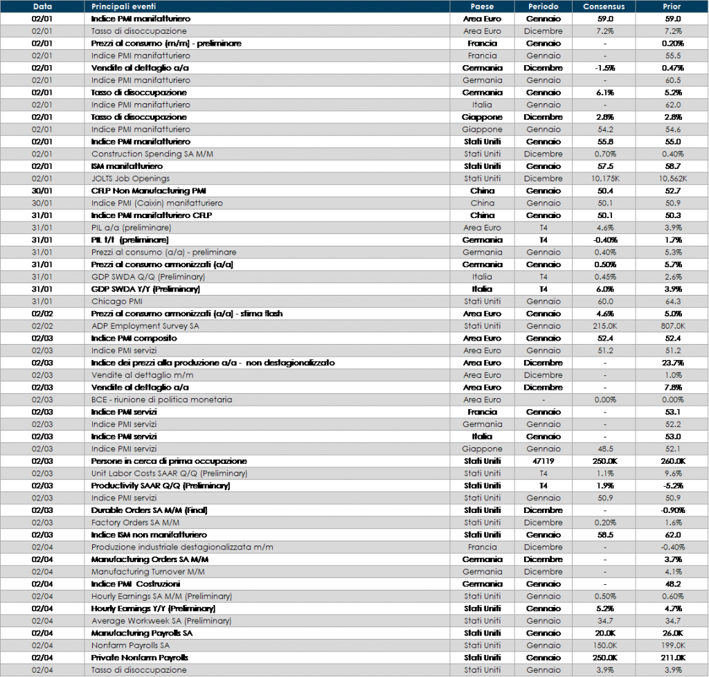 - Europa: l’attenzione sarà rivolata al meeting di politica monetaria della BCE e sulla pubblicazione del dato dell’inflazione L’inflazione core dovrebbe iniziare a correggere in un interessante contrasto con l’allargamento delle pressioni sui prezzi osservato negli altri paesi. La settimana prossima saranno pubblicati i risultati relativi alla produzione, agli indici PMI del settore manifatturiero, dei servizi e composito, al tasso di disoccupazione, e al Pil di T4 per l’Area nel suo complesso.