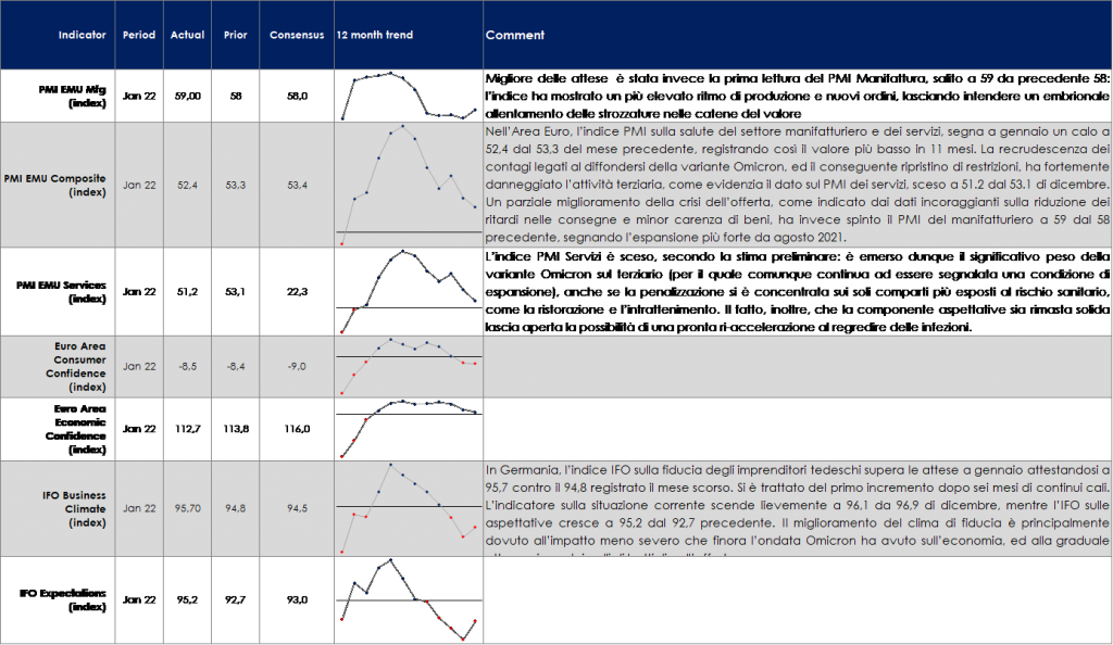 | I mercati rimangono lievemente a premio in termini assoluti (ca 15xPE22 e 3% dvd yield) rispetto alle medie storiche (ca 14-15xPE e 3% dvd yield), a fronte di una buona crescita degli utili attesi per il 2022. In termini relativi (rispetto ai tassi a 7Y/10Y) i mercati azionari rappresentano ancora un asset class con rendimenti appetibili (5%+ earnings yield).A livello aziendale abbiamo assistito all’inizio della reporting season per ultimo trimestre 2021 e le prime indicazioni sono piuttosto positive. Circa +10% di EPS beat in Europa (SXXP con 146 società su 600) e +2% in USA (S&P500 con 227/500) sebbene considerando il mercato SXXE notiamo (40/288) +1.80% sales surprise ma -2% earnings surprise. Nonostante ciò, l’atteggiamento di cautela degli investitori si riflette sulle reazioni ai risultati che sono comunque molto caute anche in presenza di buoni risultati: in media i titoli che riportano risultati superiori alle aspettative registrano performance flat, mentre i titoli che riportano in linea o soprese negative registrano performance negative. Principali “beat”: Commerzbank, Forterra, Microsoft, Sage, SEB, Tod’s, 3i, Banco Sabadell, DWS, easyJet, Euromoney, Levi Strauss & Co, Maisons du Monde, Packaging Corp of America, Sartorius Stedim Biotech, ServiceNow Inc, St James’s Place, STM, Aramis Group SAS, Hennes & Mauritz B, JCDecaux, Kaufman & Broad, Leonardo, LVMH, Mersen, SCA, Stora Enso, Unicredit, Visa. Principali “miss”: Elior, Elisa, Tesla, Essity, Vestas, Philips, Caixabank, Givaudan, Telia Company, Volvo, Henkel.
