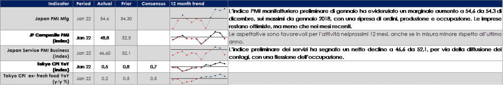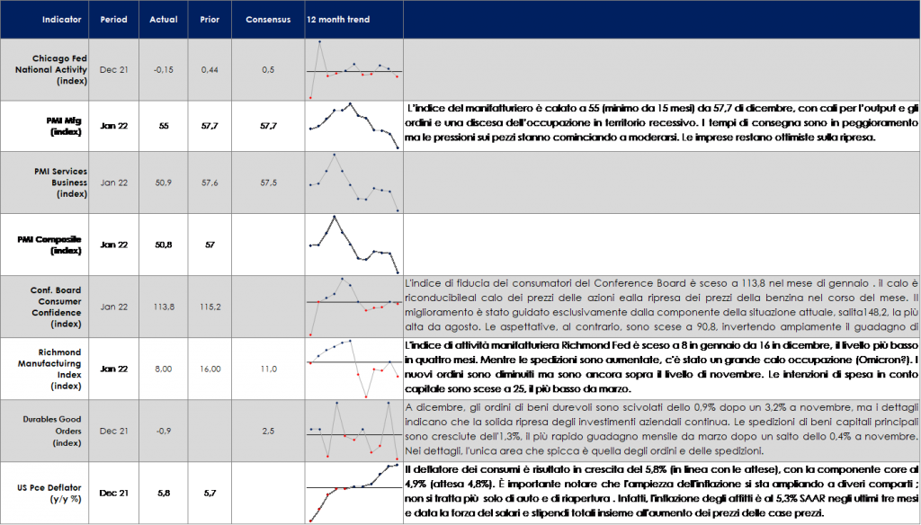 Il FMI nel suo aggiornamento di gennaio del World Economic Outlook ha rivisto le previsioni di crescita del PIL globale del 2022 al ribasso di 0,5 ppt al 4,4%. I driver principali sono stati la revisione al ribasso della crescita di Stati Uniti (1,2 ppt) e Cina (0,8 ppt). La revisione al ribasso della crescita degli Stati Uniti deriva dalla rimozione dallo scenario di base del pacchetto BBB, incorporando al contempo il ritiro anticipato dell’accomodamento monetario. Mentre lato Cina i rischi derivano dalla politica zero-COVID Il rapporto ha notato che i rischi per la crescita globale rimangono rivolti verso il basso, dato che l’emergere di nuove varianti di COVID-19 potrebbe prolungare la pandemia. Tra i rischi alle previsioni sono stati annoverati nuovi rischi di pandemia a causa di Omicron, un’inflazione più forte del previsto derivante dall’aumento dei prezzi dell’energia e dalle interruzioni dell’approvvigionamento, così come una crescita cinese più lenta a causa del continuo ridimensionamento del settore immobiliare.