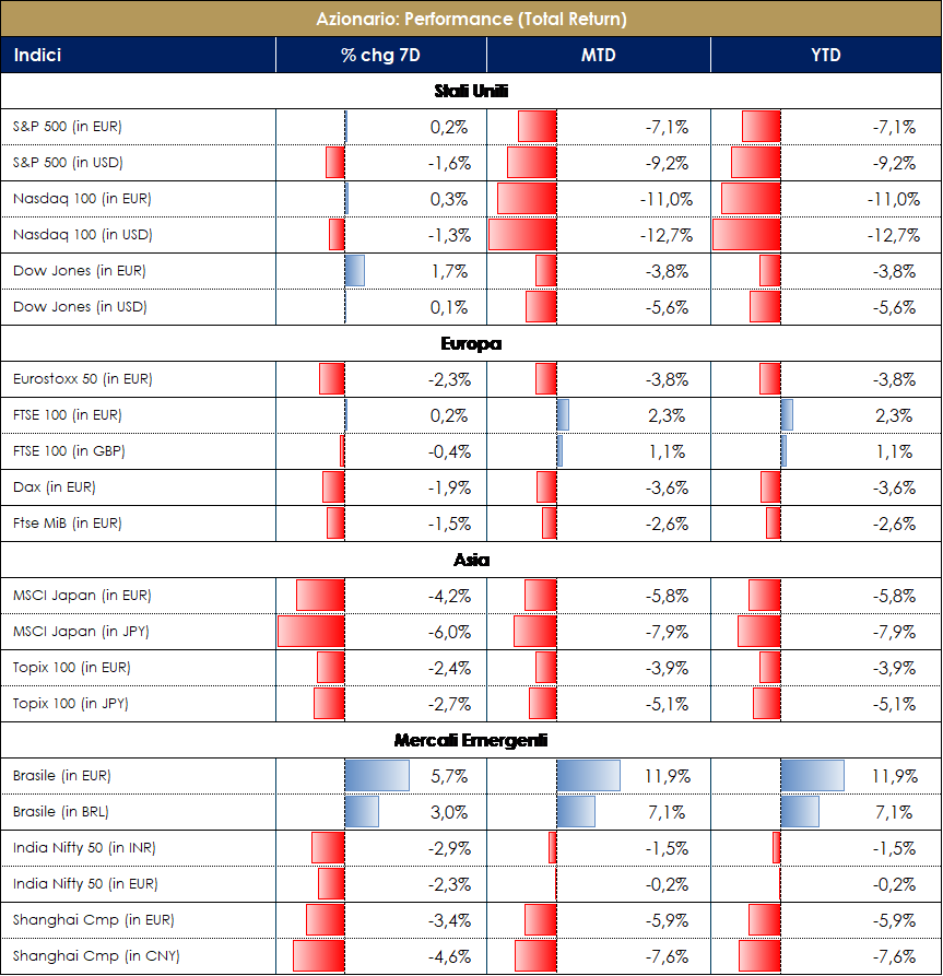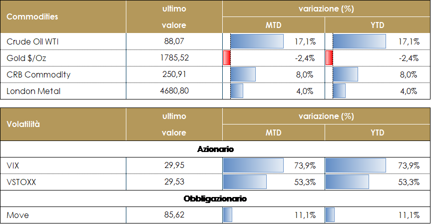 Nella tanto attesa settimana della FED (parsa più hawkish delle aspettative) i mercati hanno “dato il meglio di loro” con una volatilità prossima a 30 (VIX a 28 e V2X sull’EuroStoxx 50 sino a 32.68). Abbiamo assistito al sell-off e de-risking di molti HF/CTA contro, invece, MF e Retail che restano OW di equity. FTSE Ita e EuroStoxx a -3% con Energy a +3% e Tecnologia a -9%; S&P500 a -3.50% (Agri e Oil +6& e Auto -15%); Nasdaq 100 -5.70% con soli 6 titoli in positivo e quasi la metà dell’Indice che ha perso il 50%. Il “value” global ha sovraperformato il “growth” del +2% (11% YTD), quello europeo del +3.50% nella settimana e c/a 12% da inizio anno. Stime di crescita di OECD/IMF riviste leggermente al ribasso per il 2022: -0.4% sul 2022 a 4/4.5% e 3.8% nel 2023. Le ragioni della correzione possono essere individuate in un insieme variegato di rischi al ribasso per la crescita e al rialzo per l’inflazione: un’inflazione strutturalmente elevata per i prossimi anni potrebbe impattare i consumi delle classi medio-basse determinando una demand destruction, capace di riequilibrare le attuali stozzature delll’offerta. . In questo contesto, la persistenza dei colli di bottiglia nella logistica, componenti e mercato del lavoro s potrebbero invece determinere una forte compressione dei margini aziendali mentre una Fed behind the curve potrebbe dover essere costretta a rialzare i tassi oltre le attese di mercato provocando una restrizione delle condizioni finanziarie ed una recessione economica. Al contempo le tensioni fra Russia e Ucraina potrebbero sfociare in un conflitto, anche mondiale, con conseguenze devastanti sulla crescita economica, prezzo del petrolio alle stelle (oltre i 120 U$D) con inflazione elevata e consumi in declino. Durante questo periodo sembra essere passato in secondo piano il Covid-19. I rischi principali per i mercati azionari restano comunque una brusca frenata della crescita economica, dettata da un mix di fattori negativi: Fed più aggressiva e margini aziendali in compressione per i problemi dovuti alla supply chain, aumento delle materie prime e salari. Un ulteriore rischio al ribasso per i mercati potrebbe invece arrivare da un rallentamento della crescita mondiale causa covid o causa rallentamento dell’economia cinese.