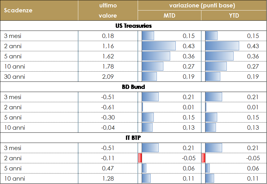 La settimana è stata dominata dalla riunione di politica monetaria del FOMC, che ha indicato con fermezza che inizierà a normalizzare la propria politica monetaria, alzando i tassi e riducendo la dimensione del proprio bilancio, rinforzando coì le aspettative di banche centrali più hawkish. Conseguentemente, i rendimenti dei titoli obbligazionari statunitensi hanno sperimentato una notevole volatilità: dopo una prima reazione in cui i rendimenti hanno toccato nuovi massimi su tutte le scadenze, c’è stato un forte reversal soprattutto sulla parte lunga della curva. Complessivamente i rendimenti sono aumentati lungo tutta la struttura a termine, anche se anno registrato un movimento più marcato sulle scadenze a breve termine, che hanno iniziato a prezzare cinque rialzi del costo del denaro nell’anno in corso. Anche la Banca del Canada ha dato seguito a un rialzo che era stato prezzato al 70%. Il mercato si aspetta un rialzo dei tassi (+25pb) anche dalla BoE la settimana prossima. Sulla scia della correlazione dei Treasury sono aumentati anche i rendimenti della struttura termine governativa tedesca, nonostante la BCE la settimana prossima si troverà in una situazione diversa e non annuncerà una restrizione della propria politica monetaria. La struttura a termine governativa tedesca curve continua ad avere una pendenza minima, come esempio il 10-30y Germania è a 55bps, vicino ai minimi dell’estate scorsa e soprattutto ben al di sotto della sua media storica. I BTP sono stati penalizzati dall’allontanarsi di una scelta condivisa per l’elezione del Presidente della Repubblica e dalla crescente incertezza circa l’esito della votazione. VIEW STRATEGICA Governativo US La Federal Reserve ha deciso di accelerare il tapering nel meeting di dicembre, mentre l’avvio del ciclo di rialzi dei tassi, non avverrà prima dell’estate 2022. Questo causerà molto probabilmente un moderato aumento dei tassi a lungo termine negli Stati Uniti. Esprimiamo una view neutrale, poiché i livelli raggiunti assicurano un carry positivo. Governativo EU: Continuiamo ad avere una view negativa sui rendimenti obbligazionari europei, aspettandoci una perdita di valore sia dalla componente carry che dalla componente prezzo |
