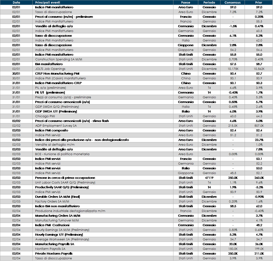 - Stati Uniti: come tutte le prime settimane del mese l’attenzione sarà rivolta alla pubblicazione del report sul mercato del lavoro. Sul fronte industriale, invece, i dati di maggiore rilevanza riguarderanno la vendita di beni durevoli, gli indici PMI di Markit sul settore manifatturiero, dei servizi e composito, gli ordini alle fabbriche, l’indice sull’attività del settore manifatturiero pubblicato dalla Federal Reserve di Dallas e gli indici ISM dei direttori agli acquisti del settore manifatturiero, dei servizi e dei prezzi