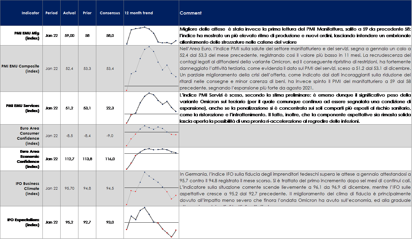 | I mercati rimangono lievemente a premio in termini assoluti (ca 15xPE22 e 3% dvd yield) rispetto alle medie storiche (ca 14-15xPE e 3% dvd yield), a fronte di una buona crescita degli utili attesi per il 2022. In termini relativi (rispetto ai tassi a 7Y/10Y) i mercati azionari rappresentano ancora un asset class con rendimenti appetibili (5%+ earnings yield).A livello aziendale abbiamo assistito all’inizio della reporting season per ultimo trimestre 2021 e le prime indicazioni sono piuttosto positive. Circa +10% di EPS beat in Europa (SXXP con 146 società su 600) e +2% in USA (S&P500 con 227/500) sebbene considerando il mercato SXXE notiamo (40/288) +1.80% sales surprise ma -2% earnings surprise. Nonostante ciò, l’atteggiamento di cautela degli investitori si riflette sulle reazioni ai risultati che sono comunque molto caute anche in presenza di buoni risultati: in media i titoli che riportano risultati superiori alle aspettative registrano performance flat, mentre i titoli che riportano in linea o soprese negative registrano performance negative. Principali “beat”: Commerzbank, Forterra, Microsoft, Sage, SEB, Tod’s, 3i, Banco Sabadell, DWS, easyJet, Euromoney, Levi Strauss & Co, Maisons du Monde, Packaging Corp of America, Sartorius Stedim Biotech, ServiceNow Inc, St James’s Place, STM, Aramis Group SAS, Hennes & Mauritz B, JCDecaux, Kaufman & Broad, Leonardo, LVMH, Mersen, SCA, Stora Enso, Unicredit, Visa. Principali “miss”: Elior, Elisa, Tesla, Essity, Vestas, Philips, Caixabank, Givaudan, Telia Company, Volvo, Henkel.