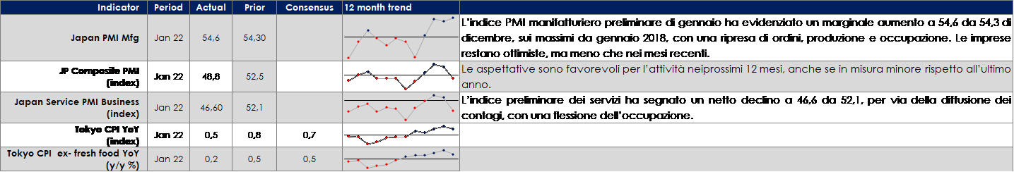 - Europa: l’attenzione sarà rivolata al meeting di politica monetaria della BCE e sulla pubblicazione del dato dell’inflazione L’inflazione core dovrebbe iniziare a correggere in un interessante contrasto con l’allargamento delle pressioni sui prezzi osservato negli altri paesi. La settimana prossima saranno pubblicati i risultati relativi alla produzione, agli indici PMI del settore manifatturiero, dei servizi e composito, al tasso di disoccupazione, e al Pil di T4 per l’Area nel suo complesso.