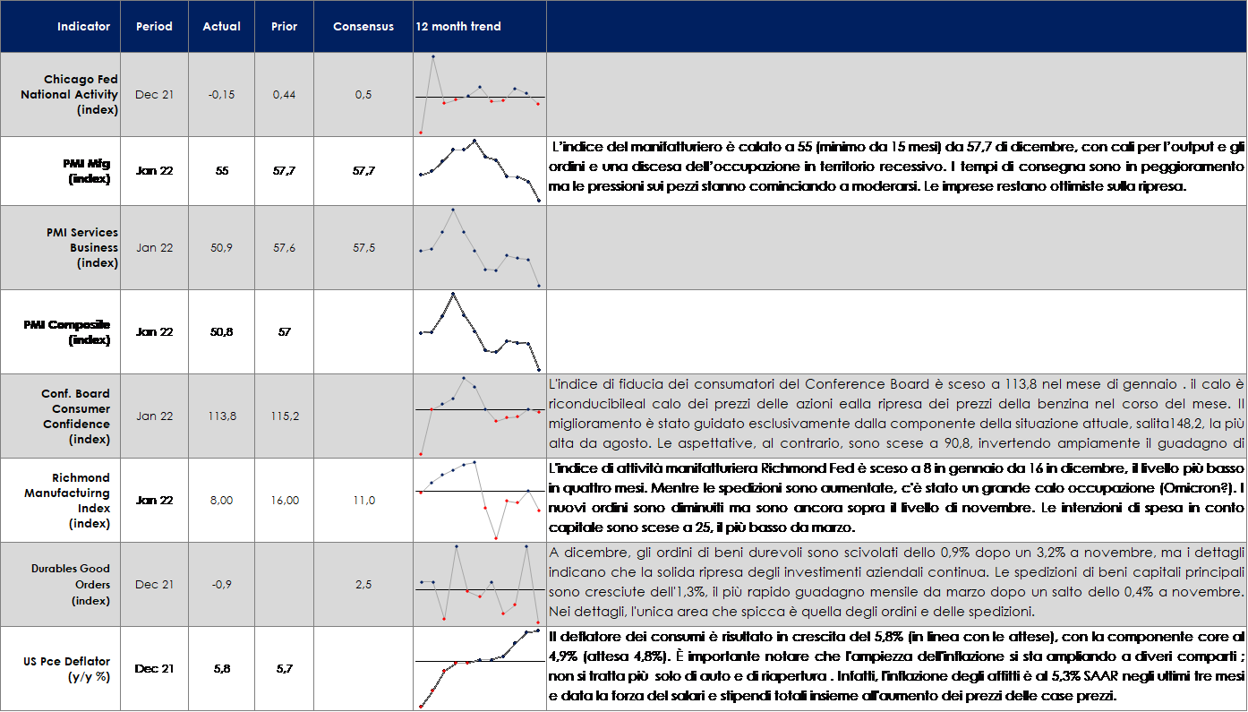 Nella tanto attesa settimana della FED (parsa più hawkish delle aspettative) i mercati hanno “dato il meglio di loro” con una volatilità prossima a 30 (VIX a 28 e V2X sull’EuroStoxx 50 sino a 32.68). Abbiamo assistito al sell-off e de-risking di molti HF/CTA contro, invece, MF e Retail che restano OW di equity. FTSE Ita e EuroStoxx a -3% con Energy a +3% e Tecnologia a -9%; S&P500 a -3.50% (Agri e Oil +6& e Auto -15%); Nasdaq 100 -5.70% con soli 6 titoli in positivo e quasi la metà dell’Indice che ha perso il 50%. Il “value” global ha sovraperformato il “growth” del +2% (11% YTD), quello europeo del +3.50% nella settimana e c/a 12% da inizio anno. Stime di crescita di OECD/IMF riviste leggermente al ribasso per il 2022: -0.4% sul 2022 a 4/4.5% e 3.8% nel 2023. Le ragioni della correzione possono essere individuate in un insieme variegato di rischi al ribasso per la crescita e al rialzo per l’inflazione: un’inflazione strutturalmente elevata per i prossimi anni potrebbe impattare i consumi delle classi medio-basse determinando una demand destruction, capace di riequilibrare le attuali stozzature delll’offerta. . In questo contesto, la persistenza dei colli di bottiglia nella logistica, componenti e mercato del lavoro s potrebbero invece determinere una forte compressione dei margini aziendali mentre una Fed behind the curve potrebbe dover essere costretta a rialzare i tassi oltre le attese di mercato provocando una restrizione delle condizioni finanziarie ed una recessione economica. Al contempo le tensioni fra Russia e Ucraina potrebbero sfociare in un conflitto, anche mondiale, con conseguenze devastanti sulla crescita economica, prezzo del petrolio alle stelle (oltre i 120 U$D) con inflazione elevata e consumi in declino. Durante questo periodo sembra essere passato in secondo piano il Covid-19. I rischi principali per i mercati azionari restano comunque una brusca frenata della crescita economica, dettata da un mix di fattori negativi: Fed più aggressiva e margini aziendali in compressione per i problemi dovuti alla supply chain, aumento delle materie prime e salari. Un ulteriore rischio al ribasso per i mercati potrebbe invece arrivare da un rallentamento della crescita mondiale causa covid o causa rallentamento dell’economia cinese.