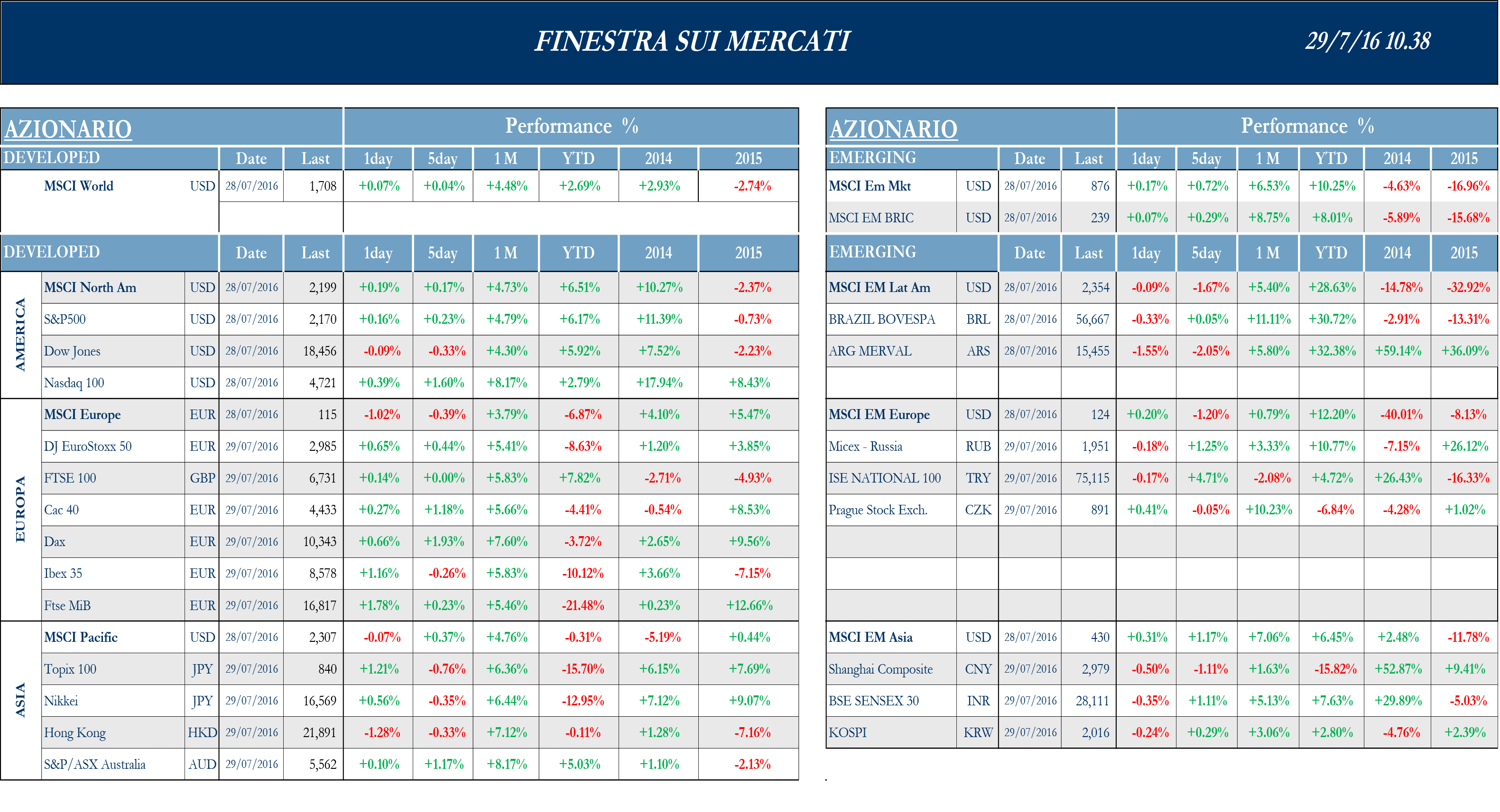 I mercati finanziari, hanno vissuto una settimana di sostanziale parità per Europa e Stati Uniti e di moderati ribassi per i paesi asiatici. Sui listini europei ha dominato, infatti, la cautela, in attesa dell’esito degli stress test bancari dell’Eba di venerdì sera, che coinvolgono 51 istituti sistemici (osservati speciali Mps, DB e Commerzbank). I listini asiatici hanno scontato il clima di attesa per il meeting di politica monetaria giapponese. Sono rimasti invece in lieve rialzo i principali indici statunitensi, in corrispondenza del meeting Fed (nulla di fatto, ma è stato aperto uno spiraglio epr un rialzo a fine anno), grazie, soprattutto, a una serie di trimestrali per buona parte superiori alle stime. Come ampiamente atteso, la Federal Reserve ha confermato i tassi di riferimento, specificando però che i rischi di breve per l’outlook economico sono diminuiti e che si continuerà a monitorare la dinamica dell’inflazione, ben al di sotto del target. Più viva, invece, la delusione per gli esiti del meeting BoJ: l’istituto nipponico attua solo un raddoppio degli acquisti di etf (da ¥3,300 mld a ¥6,000 mld), non modificando i livelli di acquisto sui bond, annunciando, tuttavia, che nella prossima riunione verranno valutati gli effetti delle attuali politiche monetarie. Per la settimana ventura, intanto, si attende il consistente pacchetto di misure di stimolo fiscale del governo Abe.