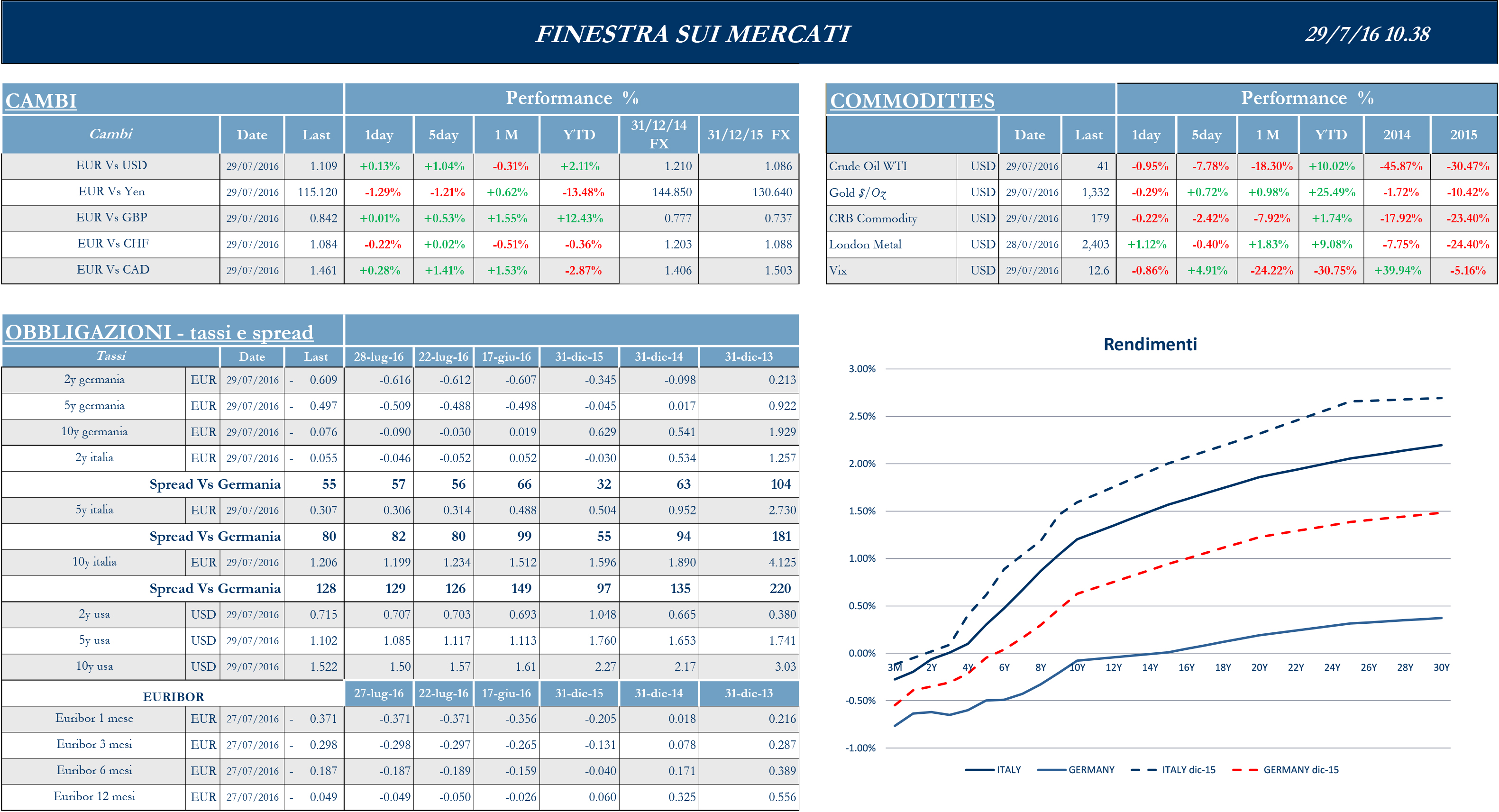 La settimana è stata caratterizzata anche dalle prime pubblicazioni dei risultati societari del Q2. In particolare, nel settore delle telecomunicazioni, Telecom Italia ha presentato i risultati del 1H 2016, confermando una crescita dell’EBITDA già nella prima parte dell’anno grazie ad una ottima perfomance nel Q2, portando il management ad aumentare la guidance per il FY2016. Inoltre, TIM e Fastweb hanno stretto un accordo per una partnership volta ad accelerare il processo di creazione di un’infrastruttura ultraveloce con tecnologia FTTH in 29 città italiane. Mediaset ha annunciato che Vivendi non intende concludere il contratto siglato l’8 aprile e che prevedeva l’acquisto del 100% di Mediaset Premium e del 3.5% di Mediaset in cambio di una partecipazione del 3.5% nella società francese. Secondo alcune fonti stampa, Mediaset potrebbe ora intraprendere un’azione legale per la richiesta di danni mentre Vivendi rifiuta l’accusa di violazione del contratto.