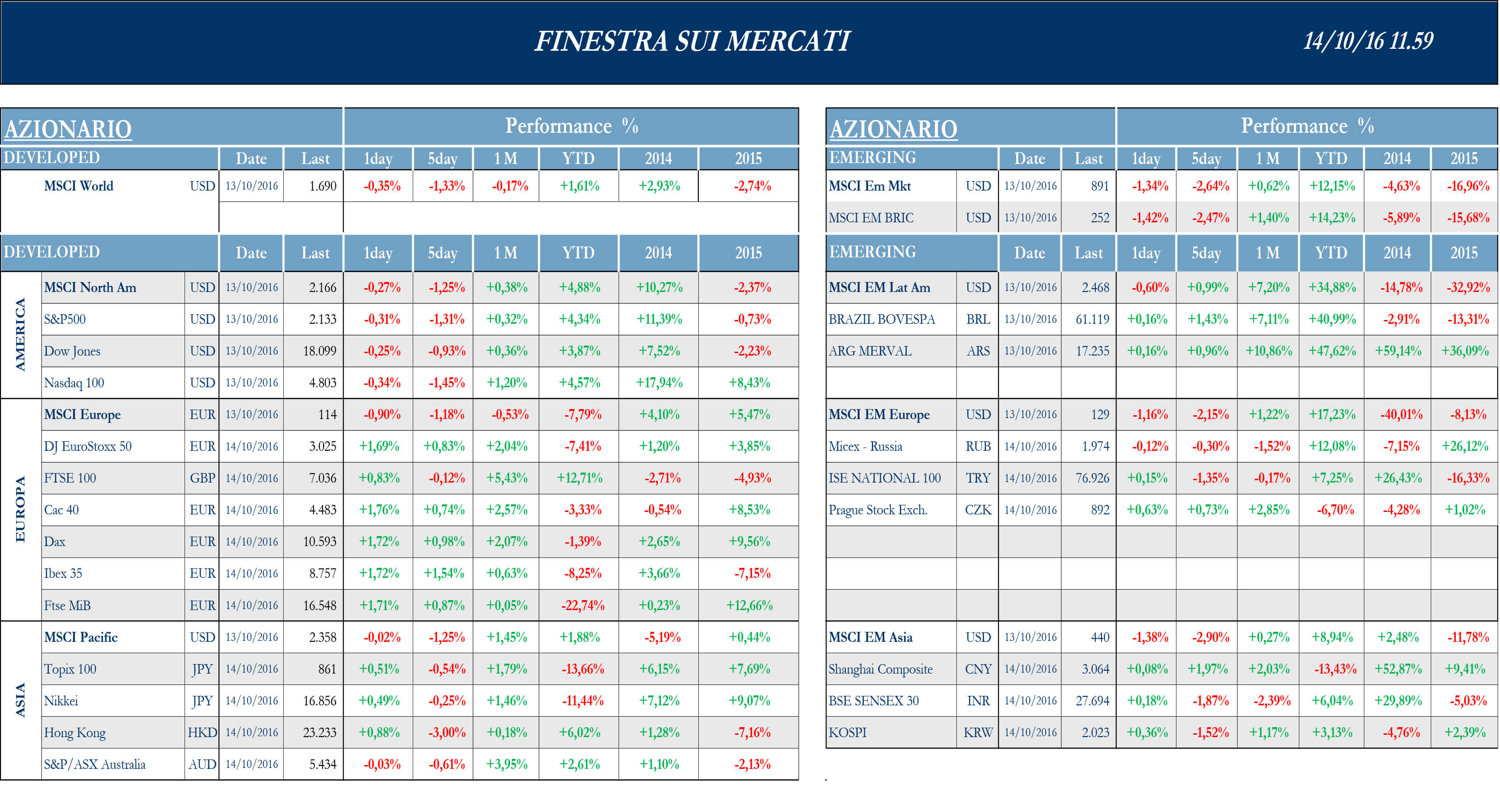 Inizio settimana in negativo per i mercati globali, che recuperano venerdì supportati dai dati positivi sull’inflazione in Cina. A guidare il nuovo aumento dell’avversione al rischio degli investitori sono stati i rinnovati timori sulla solidità della crescita mondiale ed alcuni dati societari. Sul fronte macroeconomico segnali di rallentamento dell’economia cinese sono arrivati dal dato della bilancia commerciale cinese, con il netto calo delle esportazioni e la mancata tenuta dell’importazioni, a testimoniare una certa debolezza anche sul fronte della domanda interna. Confortanti invece le indicazioni derivanti dai dati sull’inflazione in Cina con la variazione tendenziale dell’indice dei prezzi alla produzione tornata in territorio positivo per la prima volta dal 2012 e quella dell’indice dei preszzi al consumo superiore alle attese e al mese precedente. Negli Stati Uniti la pubblicazione delle minute della riunione del 21 settembre del comitato di politica monetaria ha confermato la possibilità di un rialzo dei tassi americani a dicembre ma ha tuttavia rivelato un’inusuale incertezza dei diversi membri del comitato su quanto sia necessario far progredire il mercato del lavoro e l’inflazione prima di procedere con un rialzo dei tassi. I mercati hanno reagito prezzando una probabilità leggermente più alta di un rialzo entro dicembre, che, tuttavia, dovrebbe arrivare con una visione di un percorso di rialzi cauti e graduali.